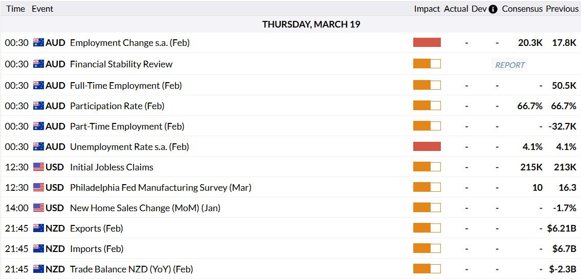 • Dữ liệu việc làm tháng 2 của Úc sẽ được công bố vào thứ Năm, với sự đồng thuận là 20,3K việc làm được thêm vào và tỷ lệ thất nghiệp dự kiến giữ ở mức 4,1% sau lần tăng lãi suất thứ hai liên tiếp của RBA lên 4,10%.
