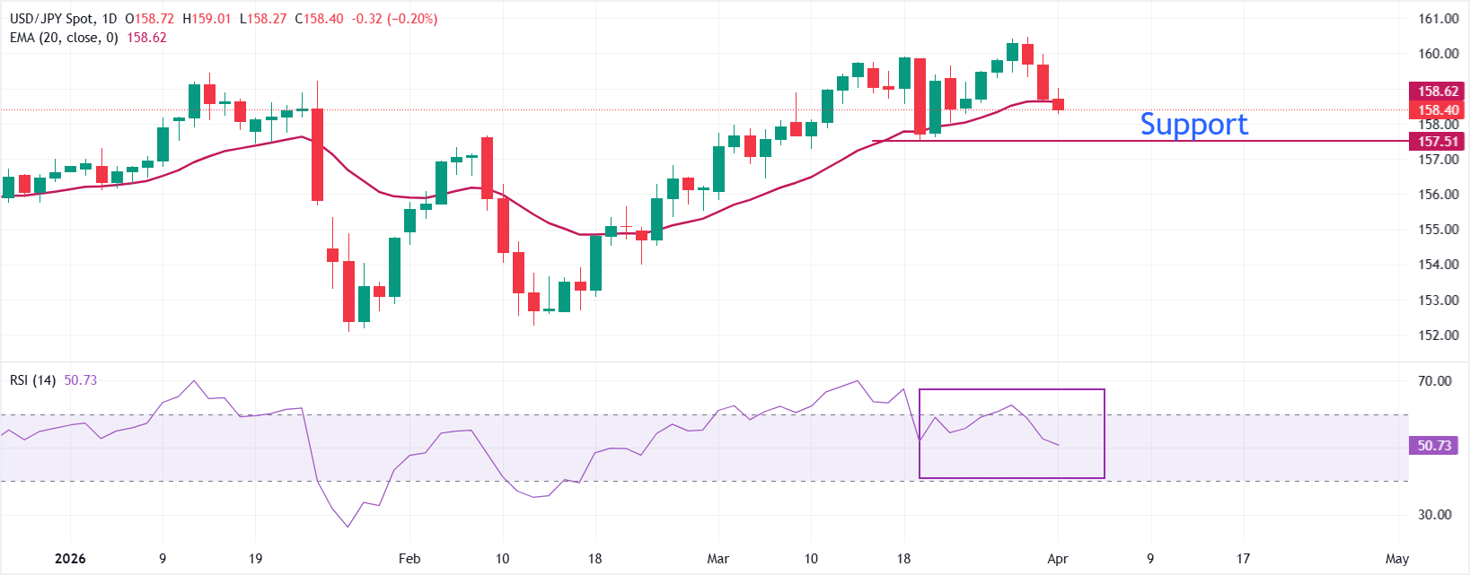 Cặp USD/JPY kéo dài chuỗi giảm giá trong ngày giao dịch thứ ba vào thứ Tư, giảm 0,26% xuống gần 158,30 trong phiên châu Âu. Cặp tiền này chịu áp lực bán khi giá dầu điều chỉnh mạnh do hy vọng ngừng bắn ở Trung Đông tăng lên đã cải thiện sức hấp dẫn của các đồng tiền như Yên Nhật (JPY), nền kinh tế của các nước này phụ thuộc nhiều vào nhập khẩu dầu để đáp ứng nhu cầu năng lượng.