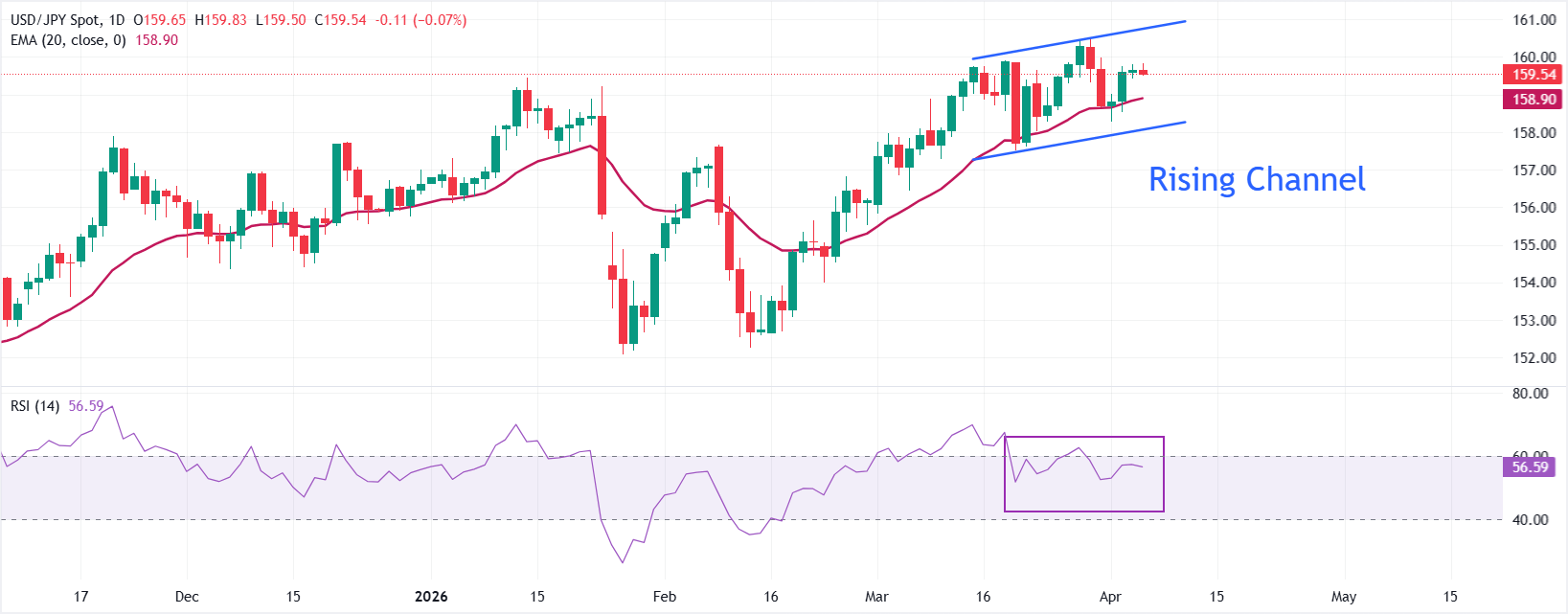 USD/JPY giảm nhẹ quanh mức 159,55 tại thời điểm viết bài. Tuy nhiên, xu hướng ngắn hạn là tăng khi giá duy trì trong kênh tăng dần và củng cố dưới biên trên. Cặp tiền giao dịch trên đường trung bình động hàm mũ 20 ngày quanh 158,90, hỗ trợ đà tăng và phù hợp với mô hình đáy cao hơn dọc theo đáy kênh gần 158,10.
