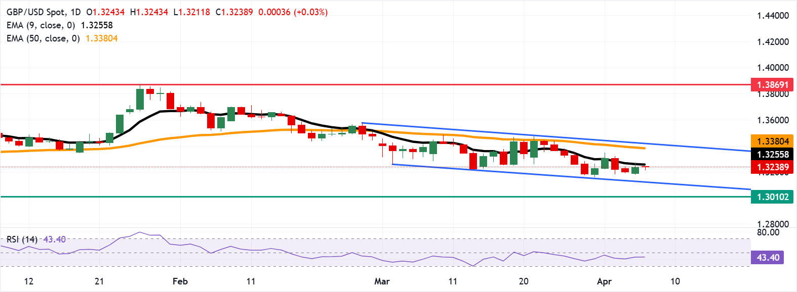 GBP/USD giữ vị trí sau khi ghi nhận mức tăng trên 0,25% trong ngày trước đó, giao dịch quanh mức 1,3240 trong giờ đầu của châu Âu vào thứ Ba. Phân tích kỹ thuật trên biểu đồ hàng ngày cho thấy xu hướng giảm giá kéo dài, khi cặp tiền di chuyển xuống trong kênh giảm.
