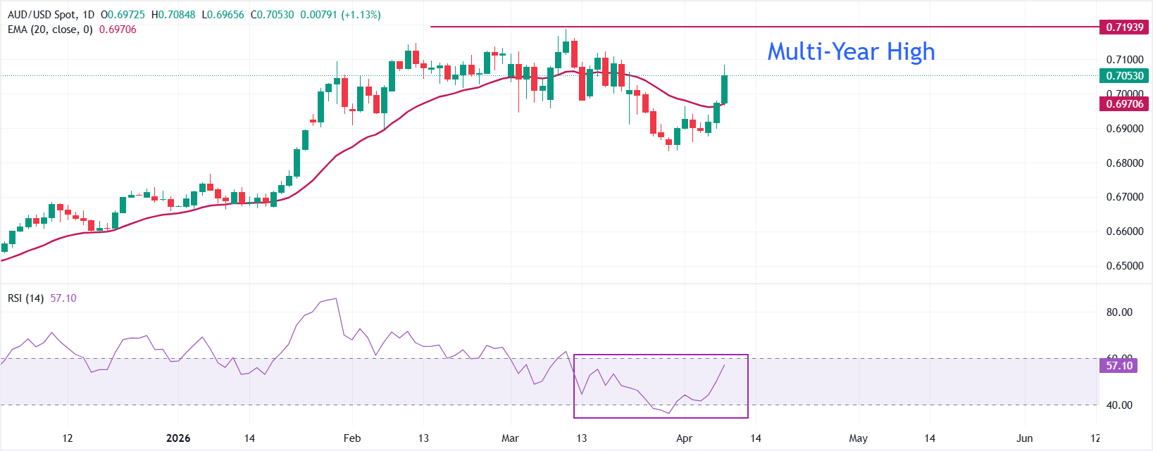 AUD/USD giao dịch cao hơn ở mức khoảng 0,7060 tại thời điểm viết bài. Cặp tiền đã mở rộng đà hồi phục trên Đường trung bình động hàm mũ (EMA) 20 ngày tại 0,6970, nghiêng về xu hướng tăng nhẹ trong ngắn hạn sau khi giữ vững vùng đáy cuối tháng Ba quanh 0,6850–0,6875. Diễn biến giá cho thấy chuỗi đóng cửa cao hơn từ vùng 0,6880, và chỉ số RSI trở lại trên mức 50 xác nhận đà tăng đang cải thiện thay vì chỉ là sự hồi phục về mức trung bình.