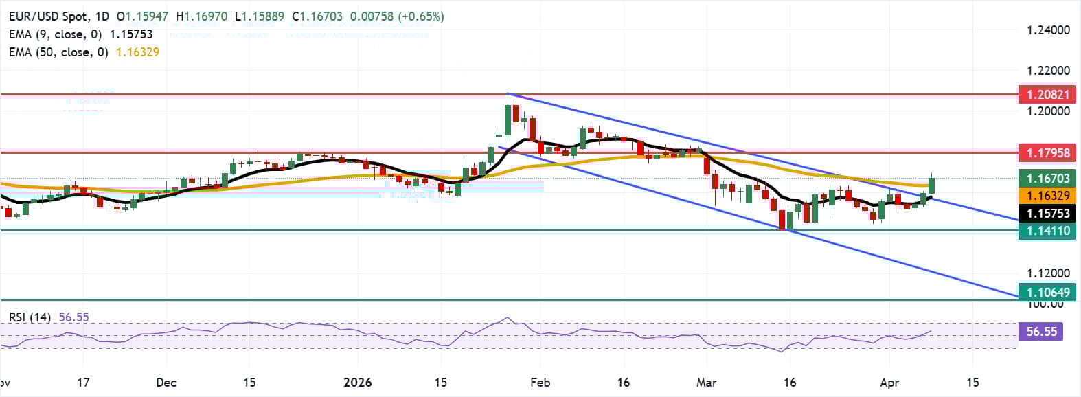 Cặp EUR/USD đã bật lên trên các đường trung bình động hàm mũ (EMA) 9 ngày và 50 ngày, tạo thành xu hướng tăng giá tạm thời sau giai đoạn giảm trước đó.