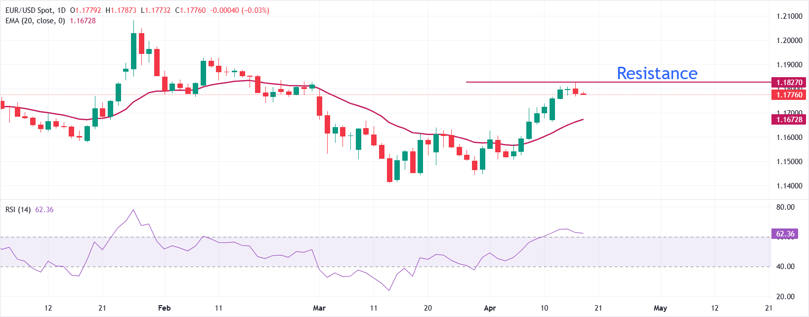 Về phía giảm, hỗ trợ ban đầu được xác định bởi EMA 20 ngày tại 1,1673, nơi một sự phá vỡ sẽ làm suy yếu đà tăng hiện tại và mở ra khả năng thoái lui sâu hơn về vùng hợp nhất giữa 1,15 gần đây. Miễn là người mua bảo vệ được ngưỡng động này, con đường ít kháng cự nhất vẫn là đi lên, khiến cặp tiền có xu hướng thử thách mức cao ngày 16 tháng 4 ở 1,1825 và mở rộng đà hồi phục về mức cao tháng 2 là 1,1929.
