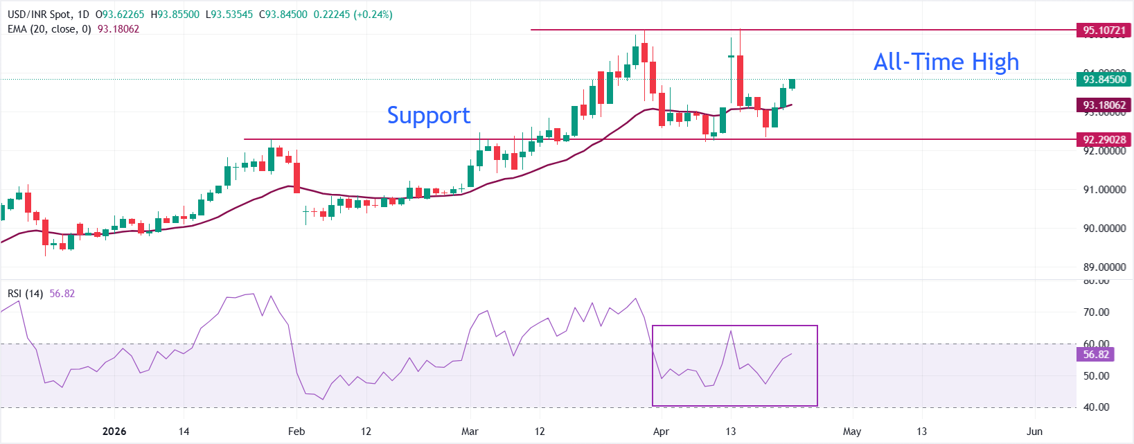 Cặp USD/INR giao dịch cao hơn ở mức khoảng 93,85 trong phiên mở cửa vào thứ Tư. Giá giữ xu hướng tăng tích cực khi duy trì trên đường trung bình động hàm mũ 20 ngày (EMA) tại 93,18. Xu hướng tăng ngắn hạn từ đáy tuần trước được hỗ trợ bởi ngưỡng động này, trong khi Chỉ số sức mạnh tương đối (RSI 14) quanh mức 56 cho thấy động lực tích cực vừa phải mà không rơi vào trạng thái quá mua, gợi ý rằng người mua vẫn kiểm soát trong ngắn hạn.
