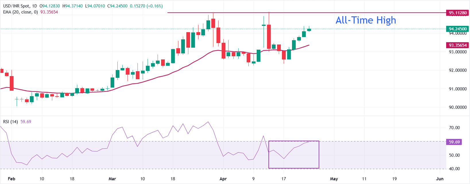 Cặp USD/INR giao dịch cao hơn trên mức 94,20 tại thời điểm viết bài, giữ xu hướng tăng tích cực khi giá giao ngay duy trì vững chắc trên đường trung bình động hàm mũ 20 kỳ (EMA) tại 93,3565. Vị trí trên đường xu hướng ngắn hạn này cho thấy người mua vẫn kiểm soát, trong khi Chỉ số sức mạnh tương đối (RSI) 14 kỳ gần 59 cho thấy động lượng tích cực nhưng không quá mức, gợi ý rằng đà tăng có thể tiếp tục miễn là cặp tiền bảo vệ được các mức hỗ trợ cơ bản.