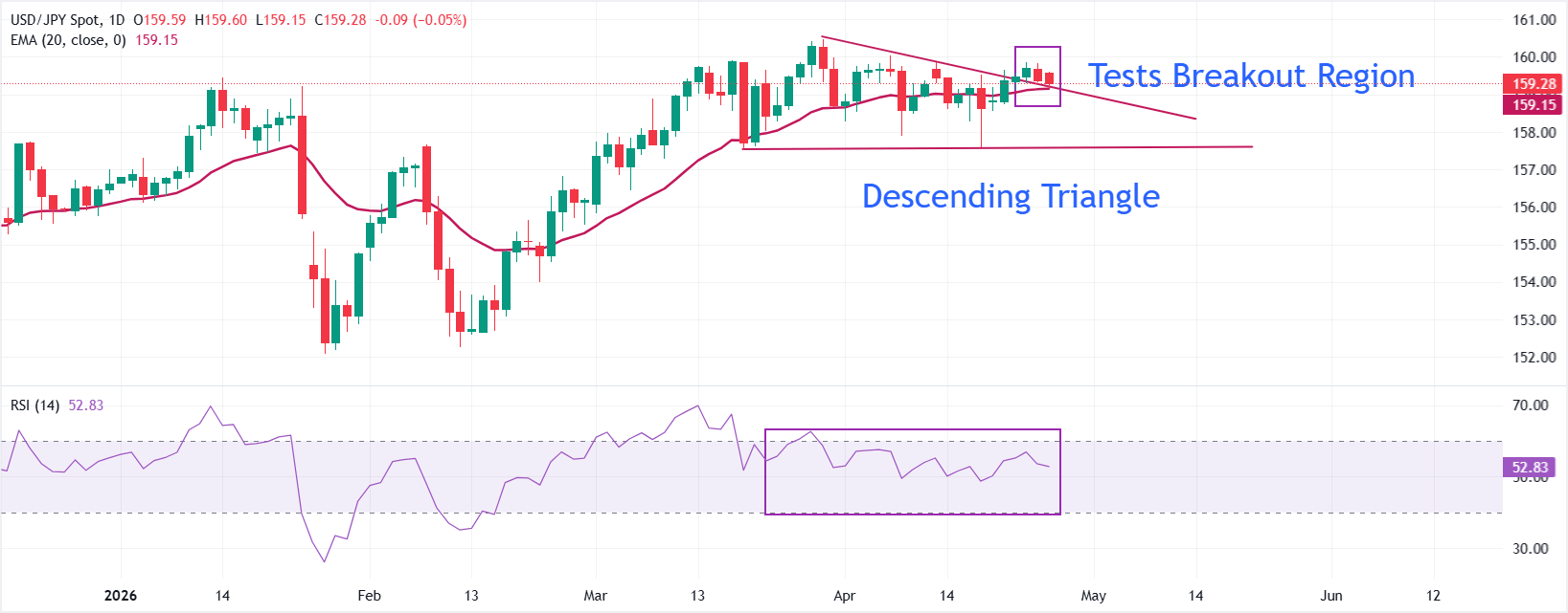 USD/JPY giảm nhẹ về gần 159,20 trong giao dịch châu Á; tuy nhiên, cặp tiền này duy trì xu hướng tăng tích cực khi giá vẫn nằm trên đường trung bình động hàm mũ 20 ngày (EMA) tại 159,14. Cặp tiền thử nghiệm sự phá vỡ mô hình Tam giác giảm dần trên khung thời gian hàng ngày gần biên giới dốc xuống ở khoảng 159,20, điều này thường dẫn đến một đợt phục hồi mới về phía trên.
