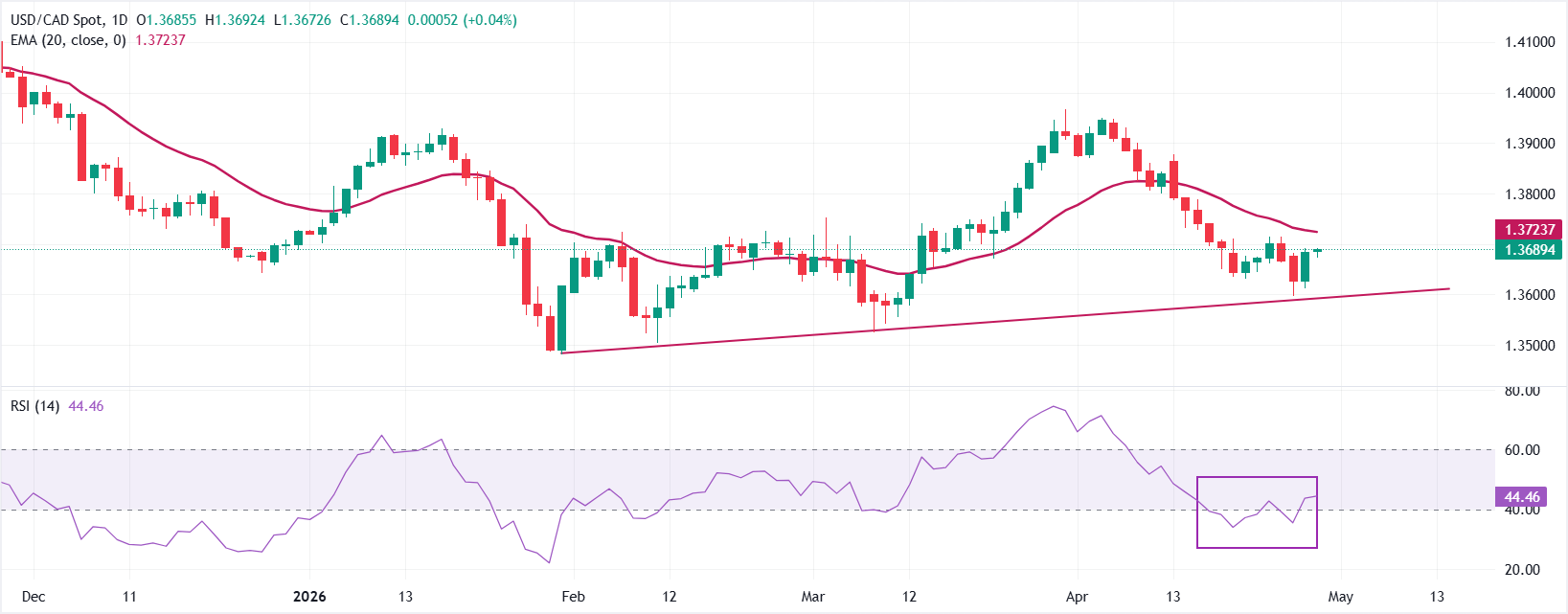 USD/CAD phản ánh sức mạnh quanh mức 1,3690 tại thời điểm viết bài. Tuy nhiên, giá vẫn giữ xu hướng giảm nhẹ trong ngắn hạn khi duy trì dưới Đường trung bình động hàm mũ (EMA) 20 kỳ ở mức 1,3724.