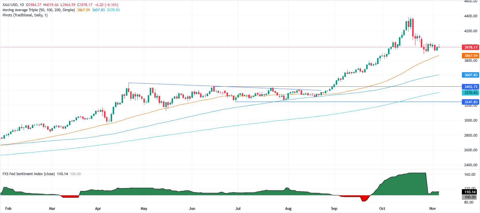 Giá vàng đang tăng nhẹ sau khi tìm thấy một đáy ngắn hạn quanh mức 3.964$, mức thấp trong ngày, mặc dù phe đầu cơ giá lên phải lấy lại mốc 4.000$ và kết thúc ngày trên mức này để mở rộng sự phục hồi. Chỉ báo sức mạnh tương đối (RSI) đang có xu hướng tăng, cho thấy đà tăng đang cải thiện, nhưng vẫn dưới mức trung lập 50.