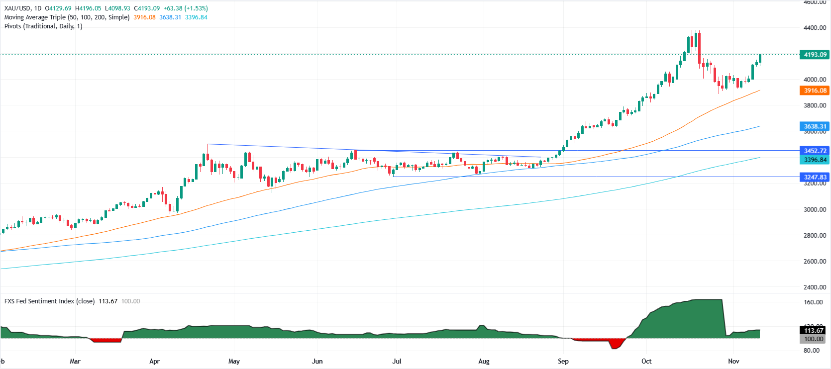Vàng (XAU/USD) tăng mạnh vượt qua mốc 4.200$ vào thứ Tư, khi lãi suất trái phiếu chính phủ Mỹ giảm và đồng đô la Mỹ mất đi những lợi nhuận trước đó. Sự cải thiện trong tâm lý rủi ro không ngăn cản kim loại vàng phục hồi sau khi giảm xuống 3.886$ vào cuối tháng 10, sau mức cao kỷ lục gần 4.400$. Tại thời điểm viết bài, XAU/USD tăng gần 2%.