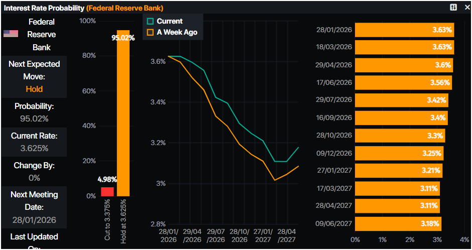 • Trong bối cảnh đó, các nhà đầu tư đã định giá 50 điểm cơ bản cắt giảm lãi suất của Cục Dự trữ Liên bang vào năm 2026, theo dữ liệu từ Prime Market Terminal.
