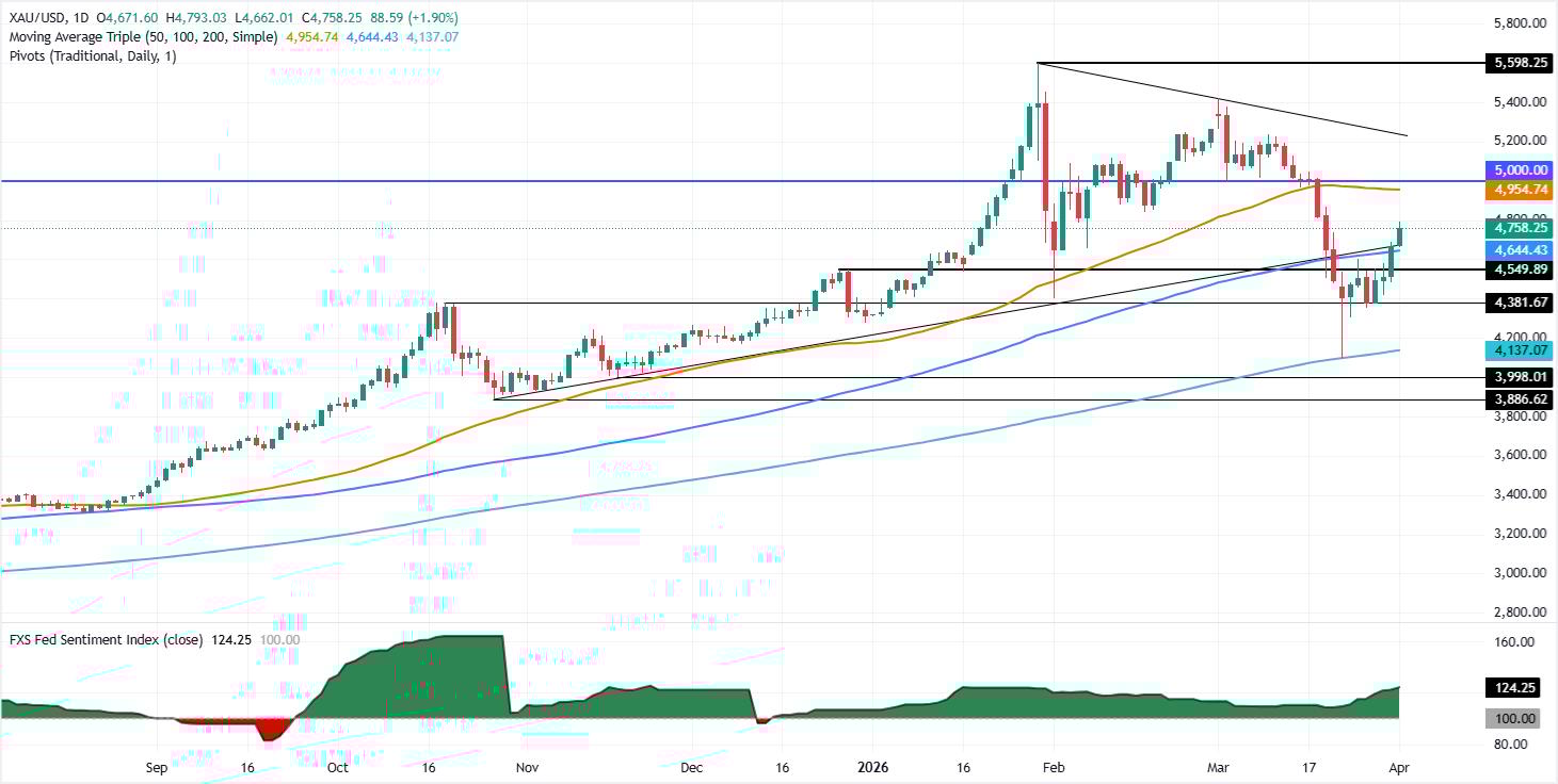 Giá vàng (XAU/USD) tăng liên tiếp ngày thứ tư vào thứ Tư, đạt mức cao nhất trong hai tuần gần 4.800$ khi đồng bạc xanh giảm giá giữa lúc suy đoán ngày càng tăng về việc kết thúc xung đột ở Trung Đông. Tại thời điểm viết bài, cặp XAU/USD giao dịch ở mức 4.758$, tăng gần 2%.