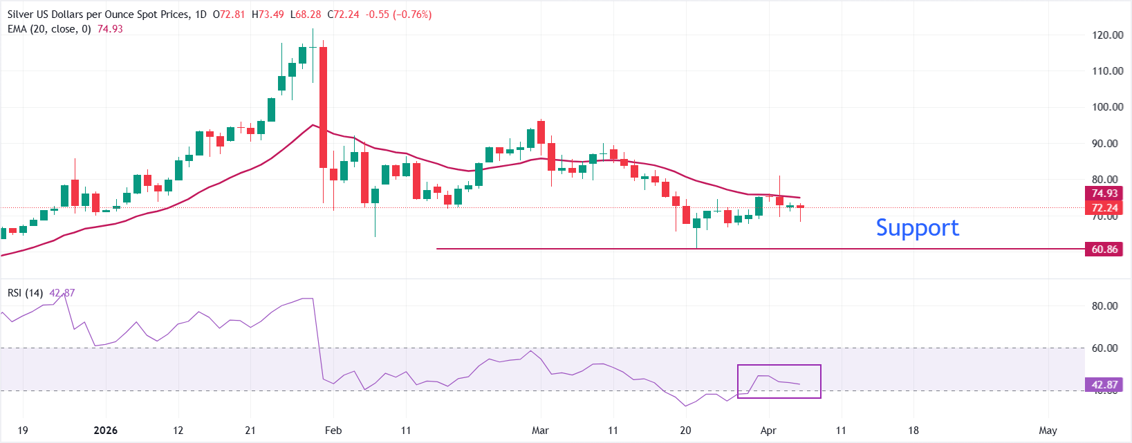 Mức kháng cự ban đầu xuất hiện tại đường EMA 20 ngày giảm dần ở mức 75,00$, và cần một sự phá vỡ trên khu vực này để giảm áp lực bán ngay lập tức. Vượt qua đó, mức kháng cự tiếp theo là đỉnh ngày 2 tháng 4 ở mức 81,13$. Về phía hỗ trợ, mức hỗ trợ ngay lập tức nằm gần 70,00$, và một sự phá vỡ bền vững dưới mức này sẽ mở đường đến vùng hỗ trợ tiếp theo quanh mức đáy ngày 26 tháng 3 là 66,71$.