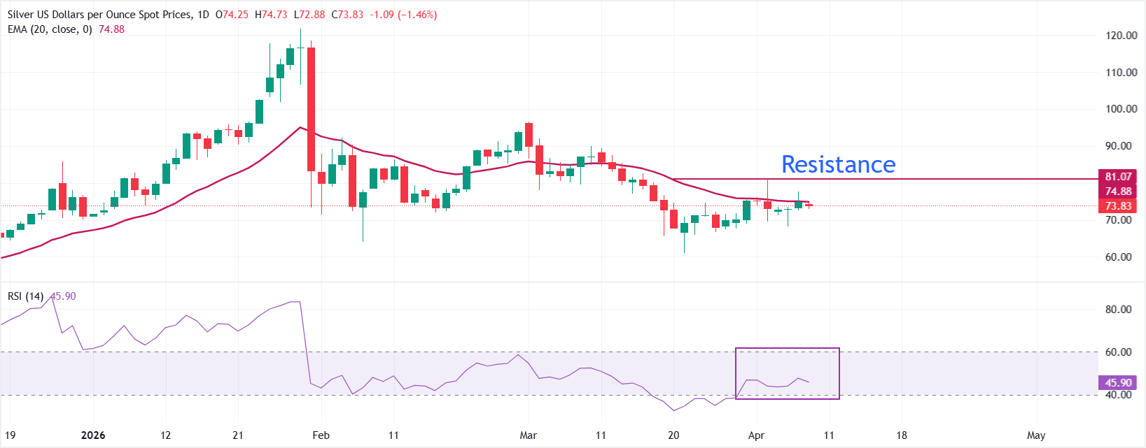 XAG/USD giao dịch gần như đi ngang quanh mức 74,00$ tại thời điểm viết bài, duy trì xu hướng giảm ngắn hạn khi giữ dưới đường Trung bình Động Lũy thừa (EMA) 20 kỳ ở mức 74,89$. Kim loại tiếp tục củng cố gần mức thấp gần đây, với chỉ số Sức mạnh Tương đối (RSI) 14 ngày hơi yếu ở mức khoảng 46 cho thấy động lực tăng giá yếu và để lộ con đường ít kháng cự hơn nghiêng về phía giảm trong khi giá vẫn bị EMA phía trên kìm hãm.