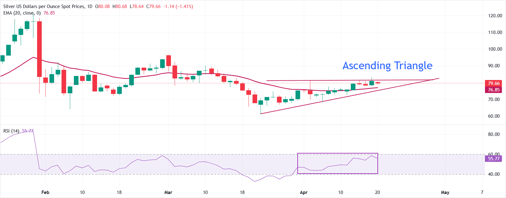 XAG/USD giao dịch thấp hơn ở khoảng 79,30$ tại thời điểm viết bài. Tuy nhiên, kim loại trắng giữ xu hướng tăng tích cực khi giá duy trì trên Đường trung bình động hàm mũ 20 ngày (EMA) ở mức 76,85$ và biên trên của mô hình Tam giác tăng dần đang tăng lên quanh mức 76$. Vị trí này cho thấy người mua vẫn kiểm soát sau khi phục hồi từ mức thấp gần đây, trong khi chỉ số sức mạnh tương đối (RSI) ở mức trung bình khoảng 56 cho thấy động lực tăng ổn định, thay vì quá mức.