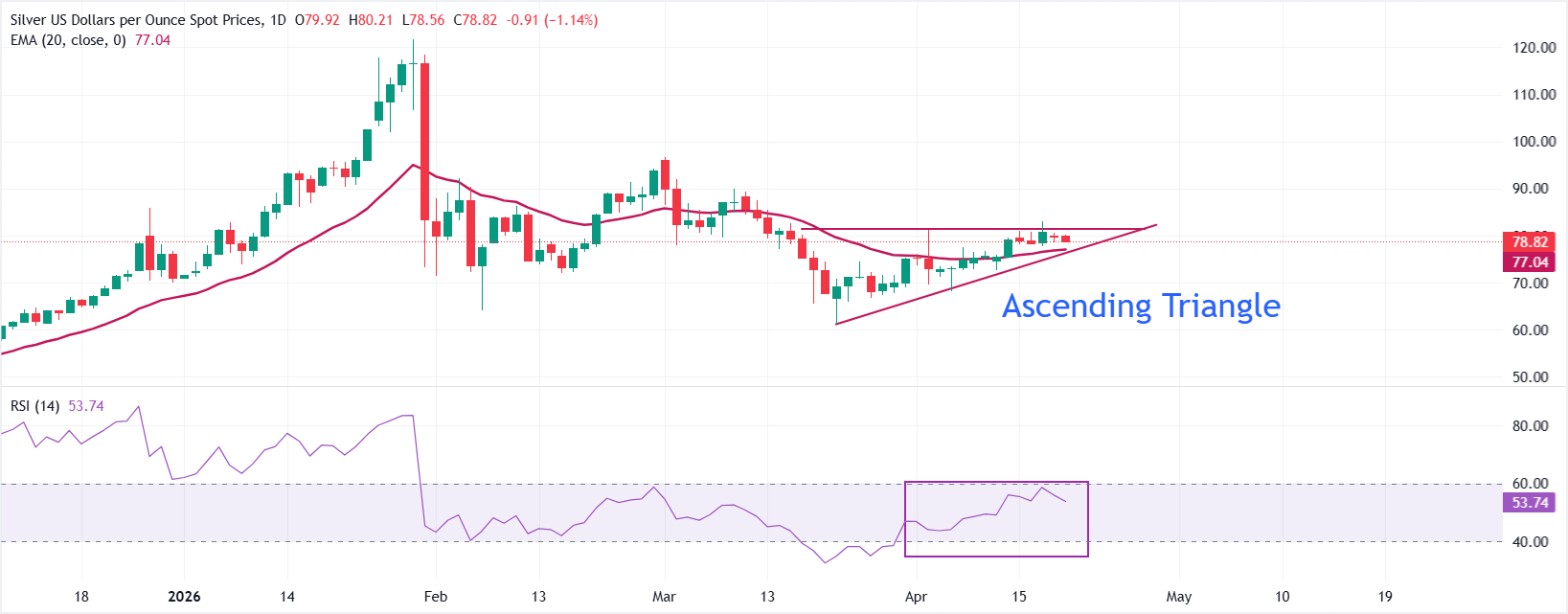 XAG/USD giao dịch thấp hơn ở mức khoảng 79,00$ tại thời điểm viết bài. Giá vẫn bám sát đường trung bình động hàm mũ (EMA) 20 ngày ở mức 77,04$, cho thấy xu hướng đi ngang. Mô hình Tam giác Tăng dần trên biểu đồ hàng ngày củng cố khả năng co hẹp biến động mạnh.