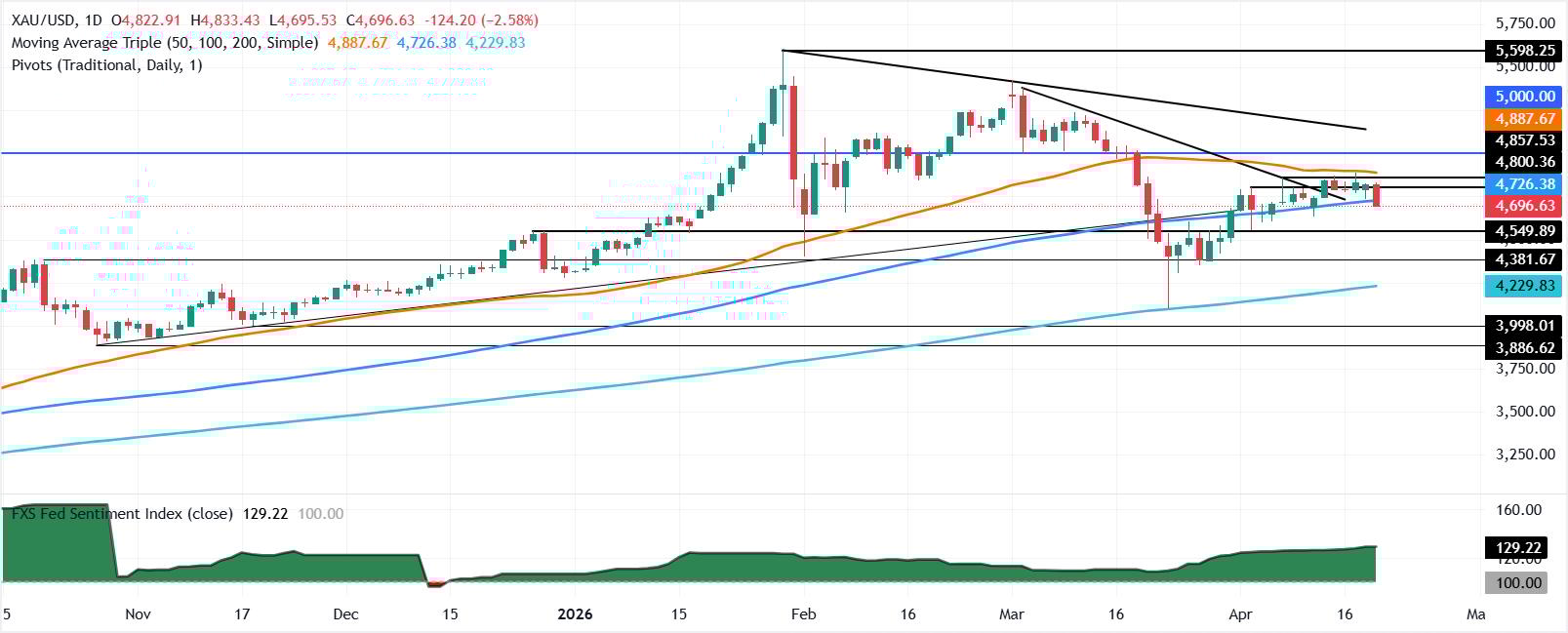 Xét về mặt kỹ thuật, giá vàng đi ngang trong tuần sau khi không thể vượt qua mức kháng cự chính tại Đường trung bình động giản đơn (SMA) 50 ngày ở mức 4.889$ và mức hỗ trợ tại 4.700$. Đáng chú ý, XAU/USD đã phá vỡ đường SMA kỹ thuật quan trọng 100 ngày ở mức 4.712$, làm lộ mức cột mốc 4.700$.