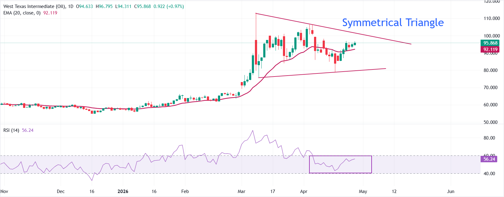 West Texas Intermediate (WTI), hợp đồng tương lai trên NYMEX, giao dịch trên 1% ở mức trên 96,00$ trong phiên giao dịch châu Âu vào thứ Ba. Giá Dầu thể hiện sức mạnh rộng hơn khi cuộc khủng hoảng năng lượng toàn cầu vẫn còn nguyên vẹn sau thời gian dài đóng cửa Eo biển Hormuz, một tuyến đường quan trọng chiếm gần 20% nguồn cung năng lượng toàn cầu.