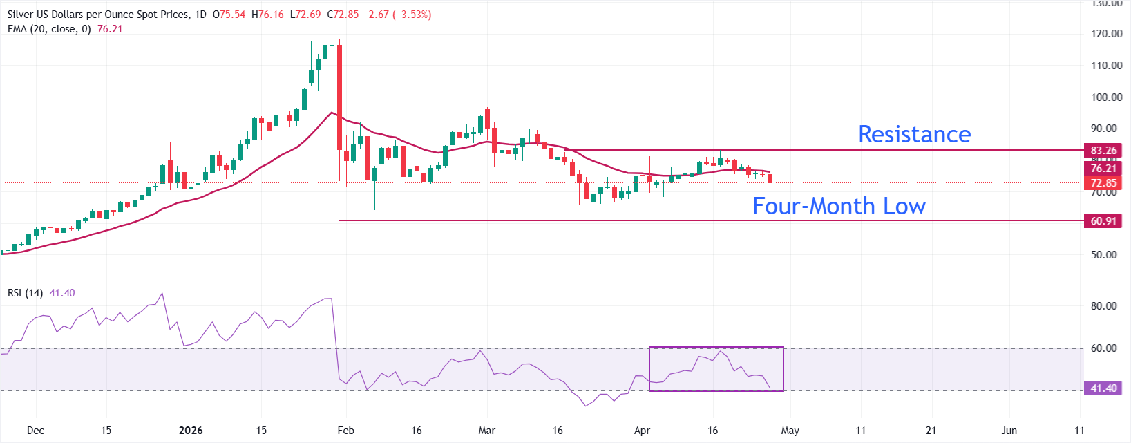 XAG/USD giao dịch giảm mạnh quanh mức 72,90$, duy trì xu hướng giảm ngắn hạn khi giá nằm dưới Đường trung bình động hàm mũ 20 ngày (EMA) ở khoảng 76,22$. Vị trí giá giao ngay dưới EMA ngắn hạn này cho thấy các đợt tăng vẫn bị hạn chế hiện tại, trong khi Chỉ số sức mạnh tương đối (RSI) quanh mức 42 nghiêng về phía giảm mà chưa báo hiệu vùng quá bán, ám chỉ người bán vẫn còn dư địa để đẩy giá đi xuống.