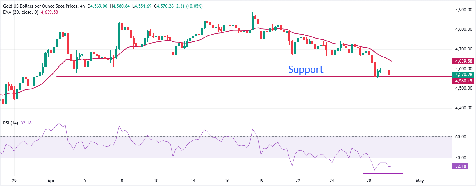 Trên biểu đồ 4 giờ, XAU/USD duy trì dưới đường trung bình động hàm mũ (EMA) 20 kỳ tại 4.639,62$, giữ xu hướng ngắn hạn giảm giá khi các đợt hồi phục gần đây không thể lấy lại vùng cung động này.