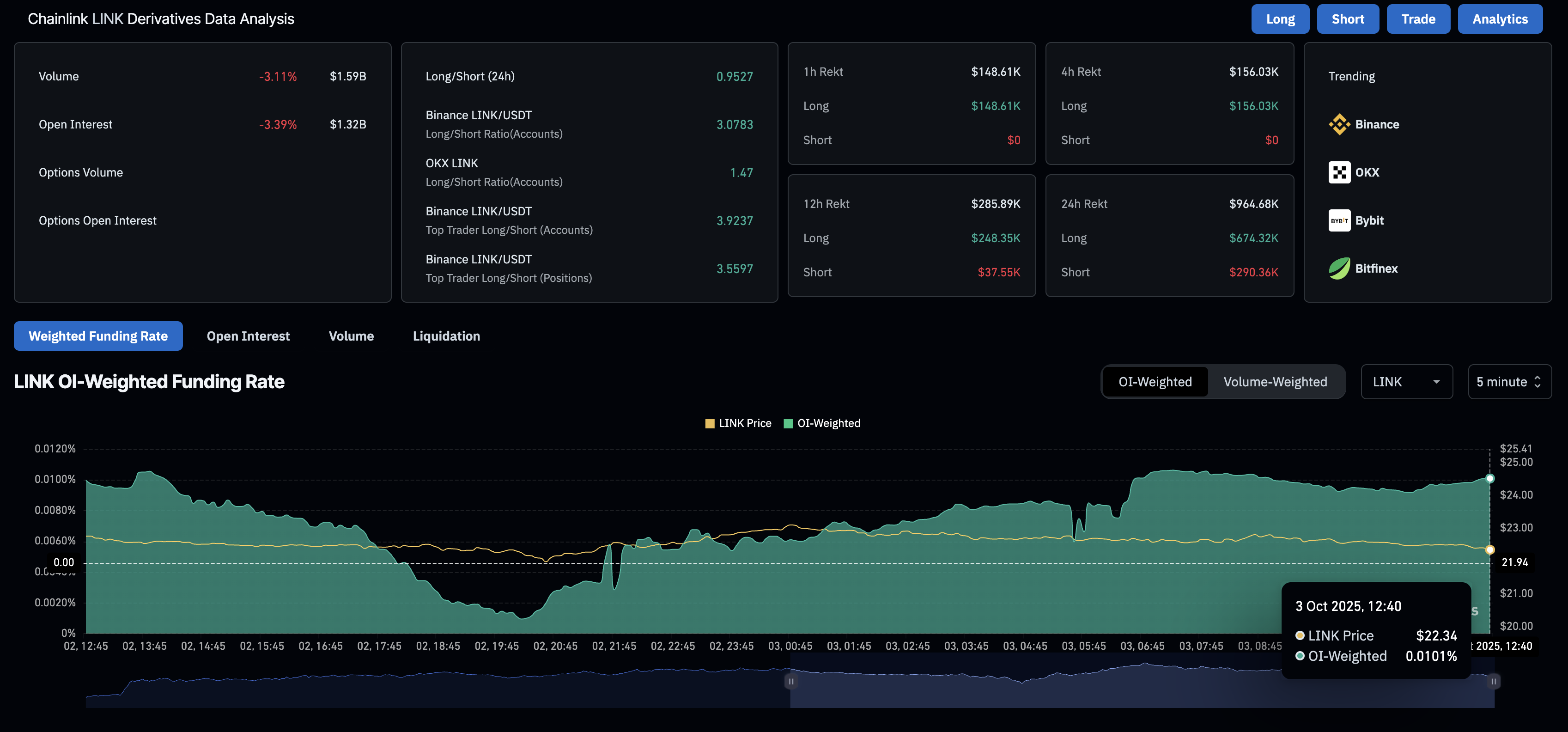 Chainlink’s retail demand is also at risk as the short-term decline dwindles the sentiment of derivatives traders. CoinGlass data indicates that the LINK Open Interest (OI) has decreased by over 3% in the last 24 hours, reaching $1.32 billion.