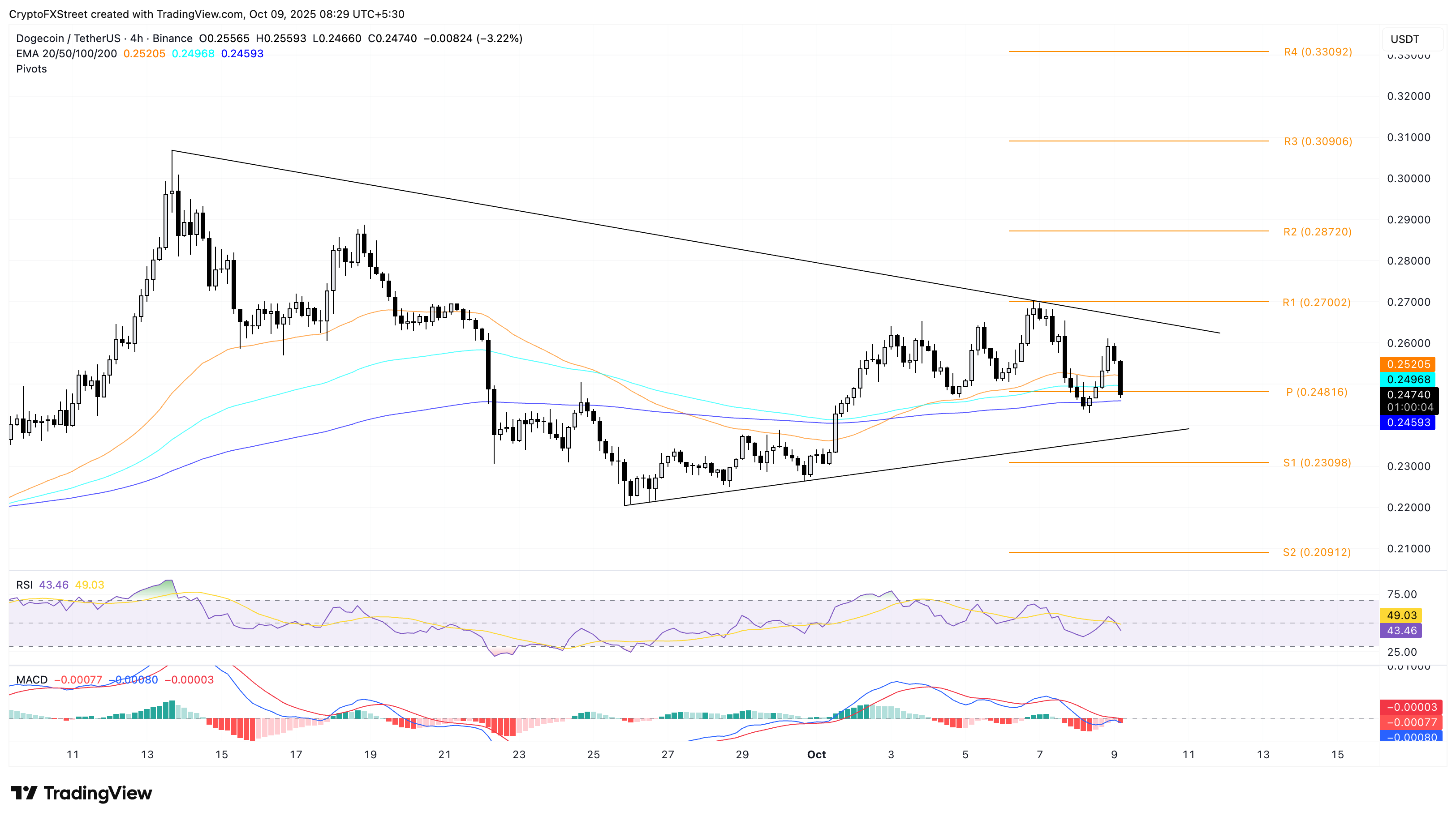 Dogecoin is down over 2% at the time of writing on Thursday, nearly erasing the 3.57% gains from the previous day, which would extend the declining trend. DOGE approaches the 200-period Exponential Moving Average (EMA) at $0.24593 on the 4-hour chart.