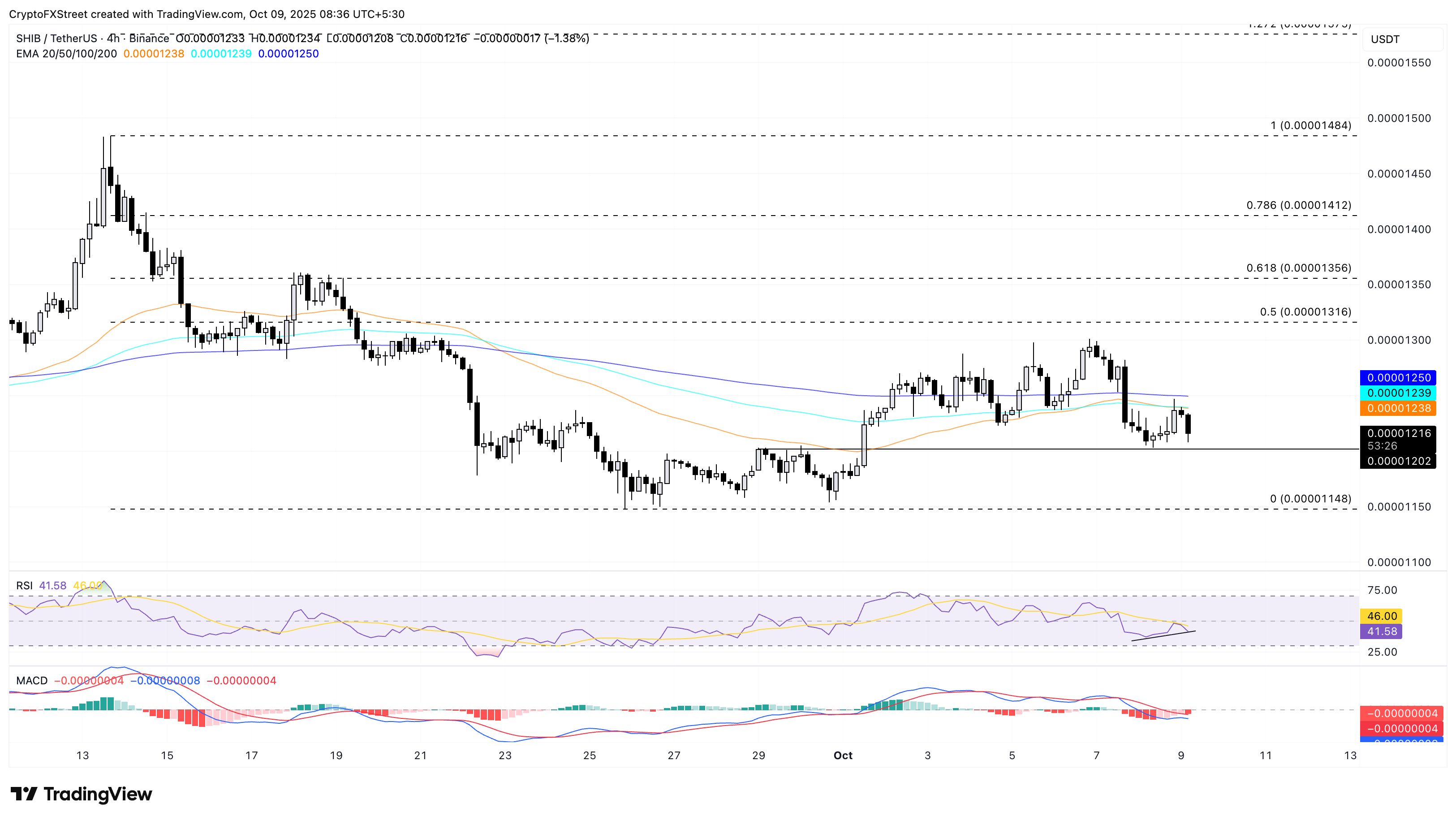 Shiba Inu retraces to the $0.00001202 support level on the 4-hour chart, struggling to sustain above the 200-period EMA at $0.00001250. The declining trend of the 50-, 100-, and 200-period EMAs on the same chart indicates a prevailing downtrend.