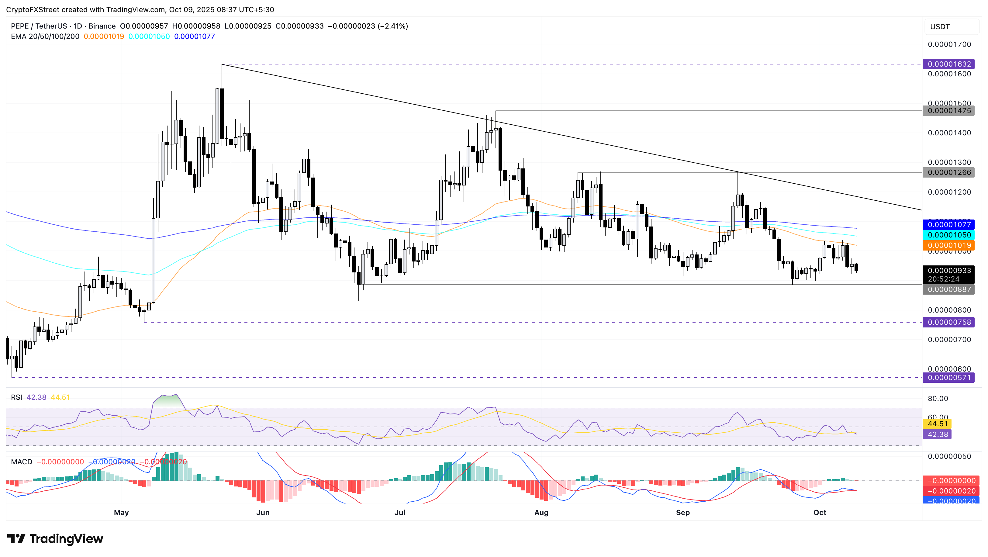 Pepe reverses from the 50-day EMA at $0.00001019, failing to hold above the psychological mark. The frog-themed meme coin reversal approaches the $0.00000887 support floor, marked by the June 22 close.