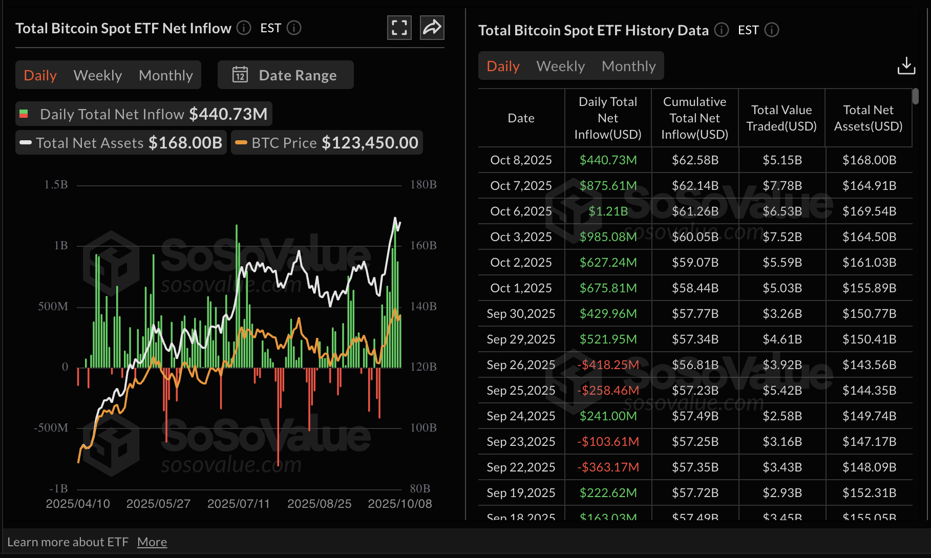 Bitcoin spot Exchange Traded Funds (ETFs) marked eight consecutive days of inflows on Wednesday, with $441 million, reflecting steady demand from institutional investors.