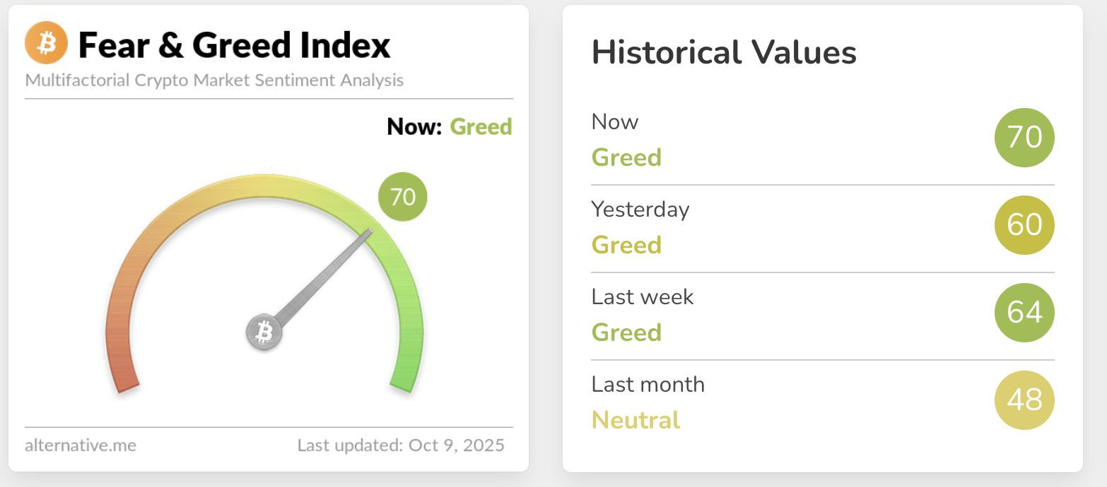 Alternative.me Crypto Fear & Greed Index rises to 70, indicating a sentiment of greed in the cryptocurrency market, following Bitcoin’s surge to a new record high of $126,199. Monday.