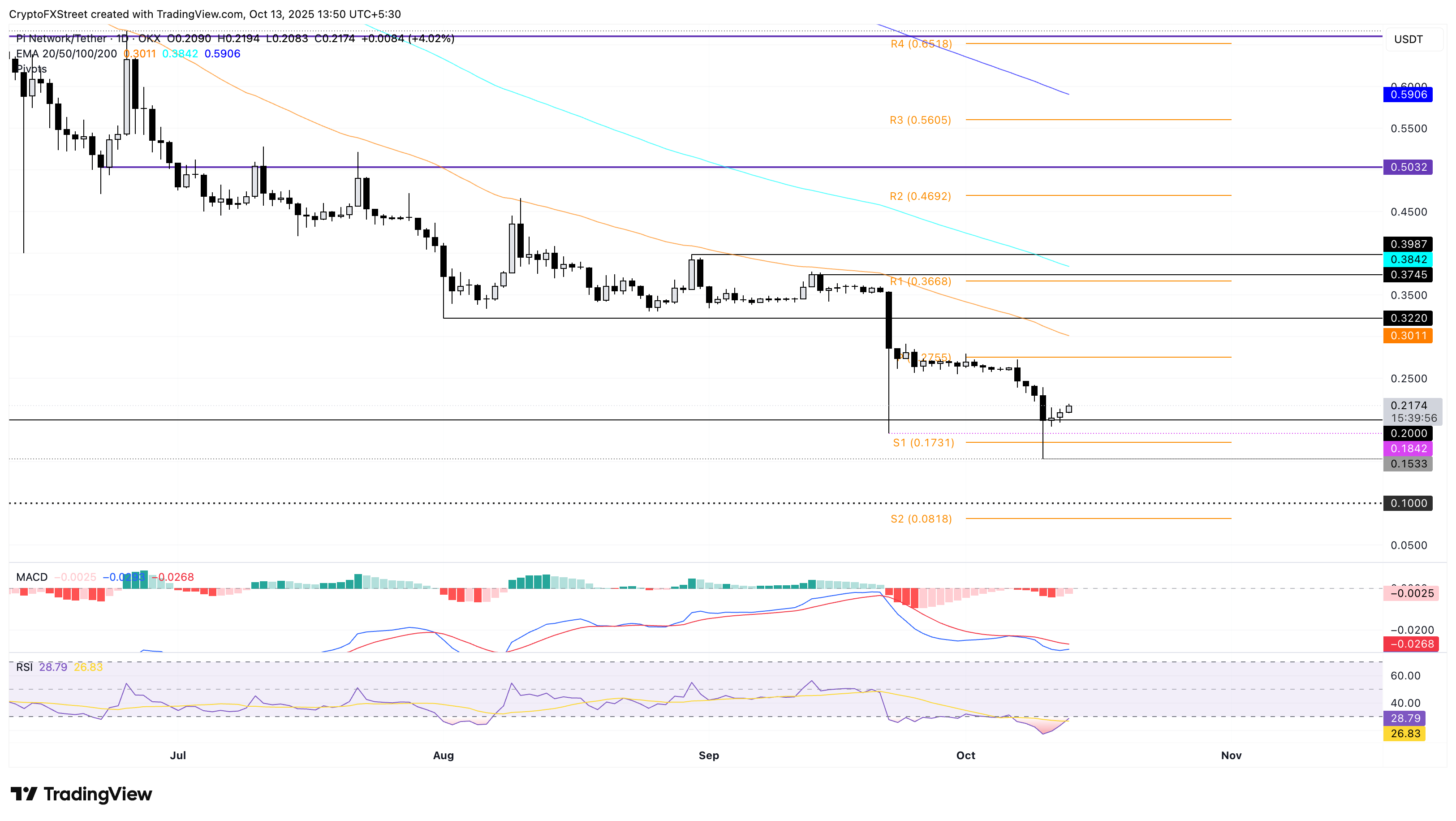 Pi Network price dropped 13% on Friday, resulting in a fresh low of $0.1533 before retracing higher to close at $0.1996 on the day. At the time of writing, PI trades above $0.2150, hinting at a potential V-shaped reversal.