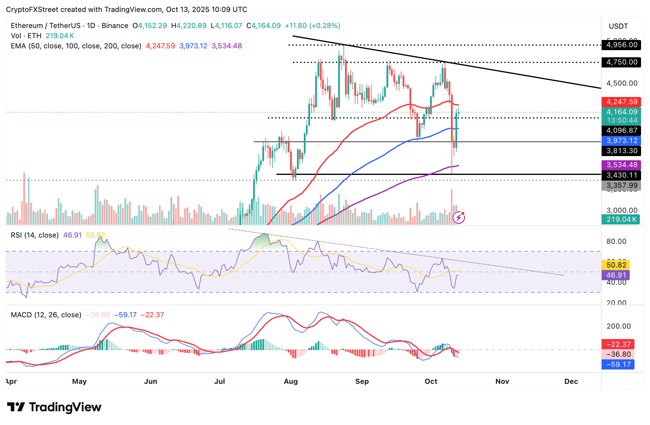 Ethereum has recouped part of the losses experienced last week, rising from $3,430 to trade between $4,100 and $4,200 as of Monday. The 100-day EMA at $3,973 and the 200-day EMA at $3,534 back the prevailing positive market sentiment.