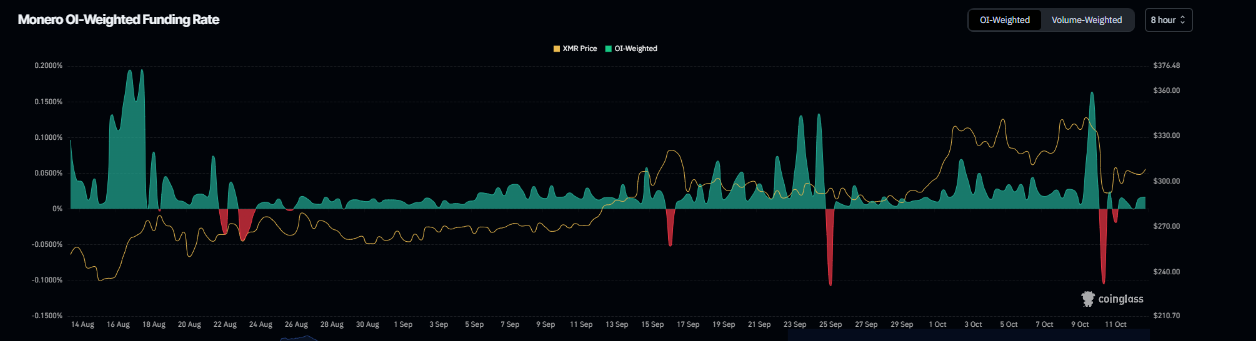 CoinGlass’s OI-Weighted Funding Rate data shows that the number of traders betting that the price of Monero will slide further is lower than that anticipating a price increase.
