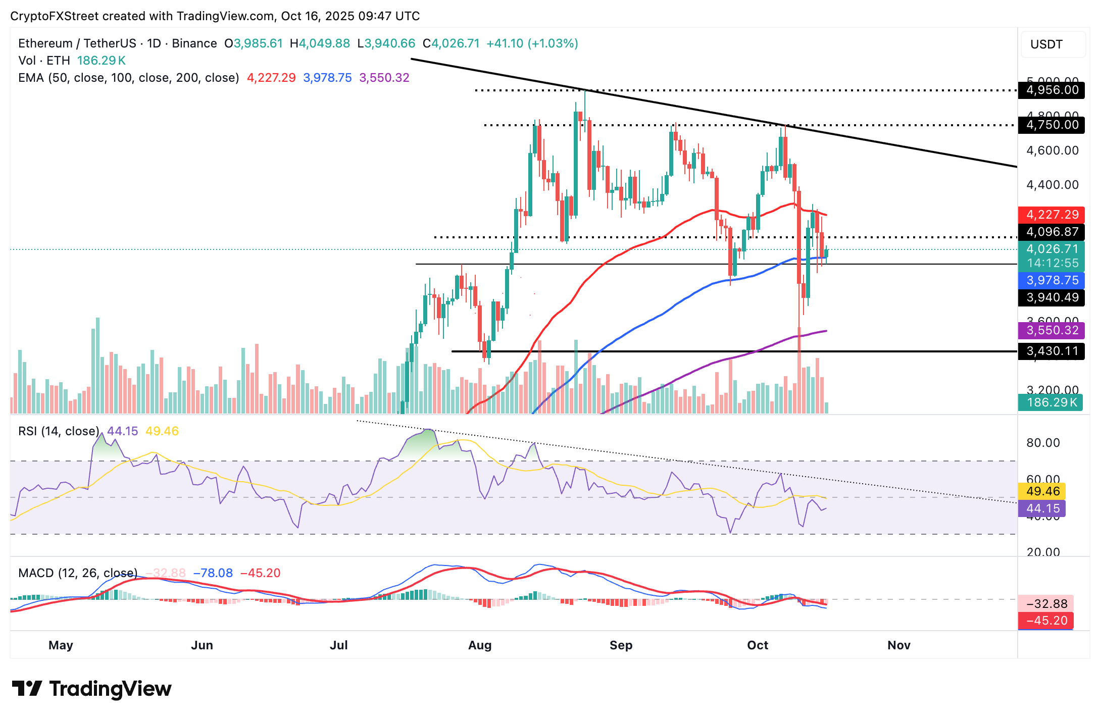 Ethereum is trading around the 100-day EMA currently at $3,978 amid an overall downtrend, reflecting a sticky bearish sentiment in the broader crypto market.