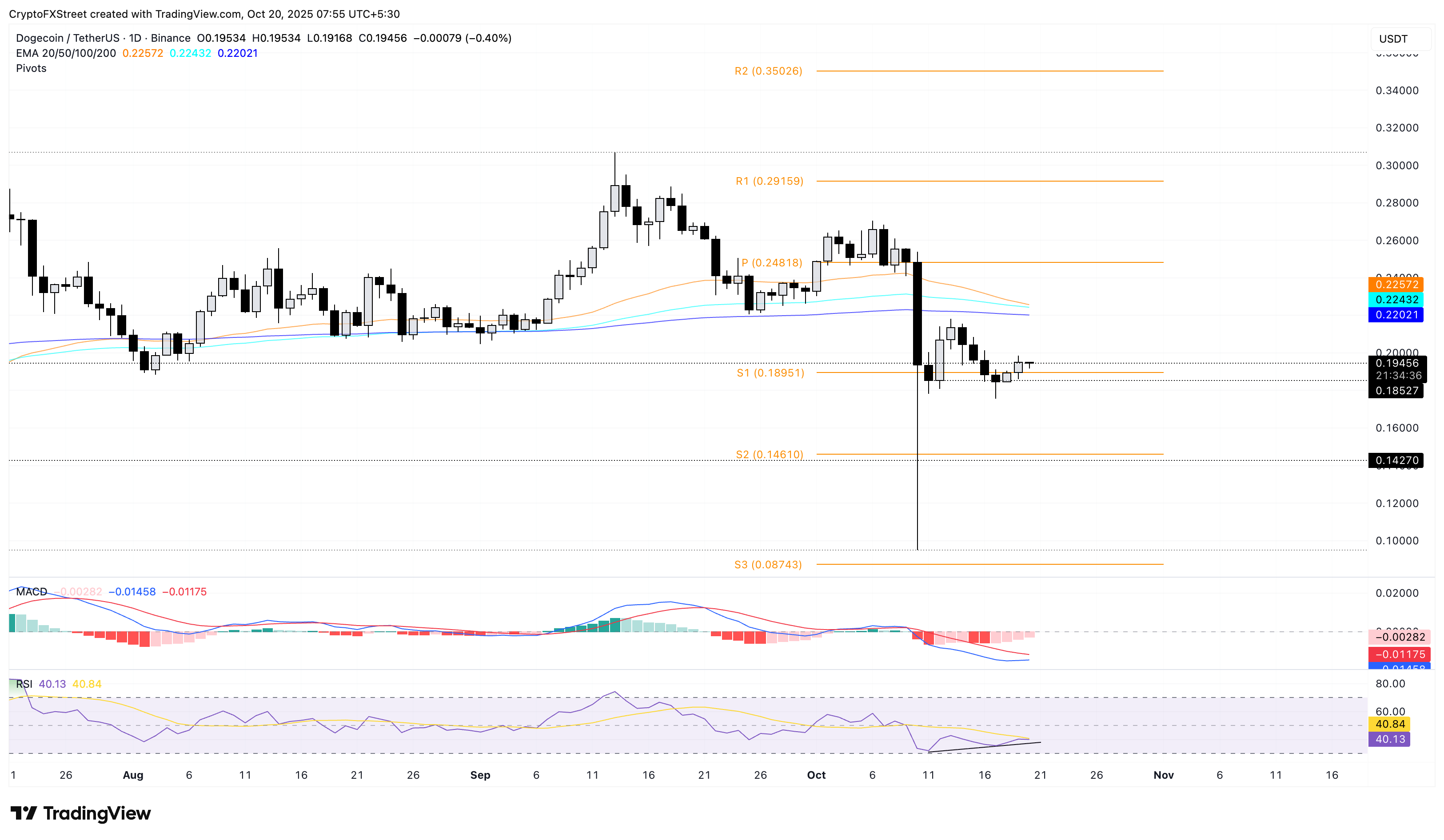 Dogecoin holds steady above $0.19000 at press time on Monday, following the 5% gains from two consecutive days of recovery. The meme coin approaches the $0.20000 psychological level after bouncing off the $0.18527 support formed on October 11.