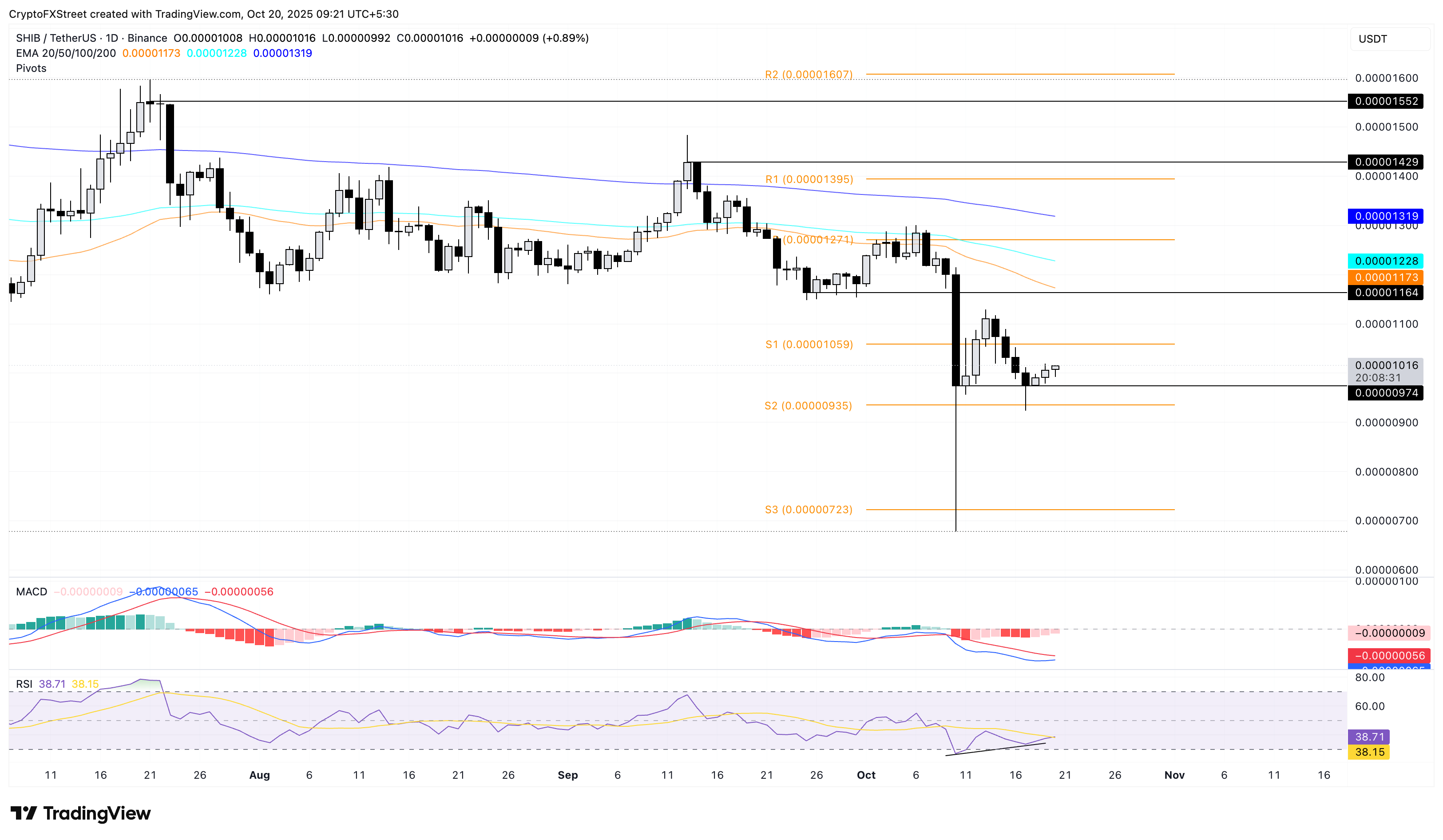 The momentum indicators on the daily chart suggest a decline in selling pressure as the recovering MACD approaches its signal line, preparing for a potential crossover. At the same time, the RSI at 38 shows an upward trend from the oversold zone, while SHIB retested the $0.00000974 support, which marks a bullish divergence.