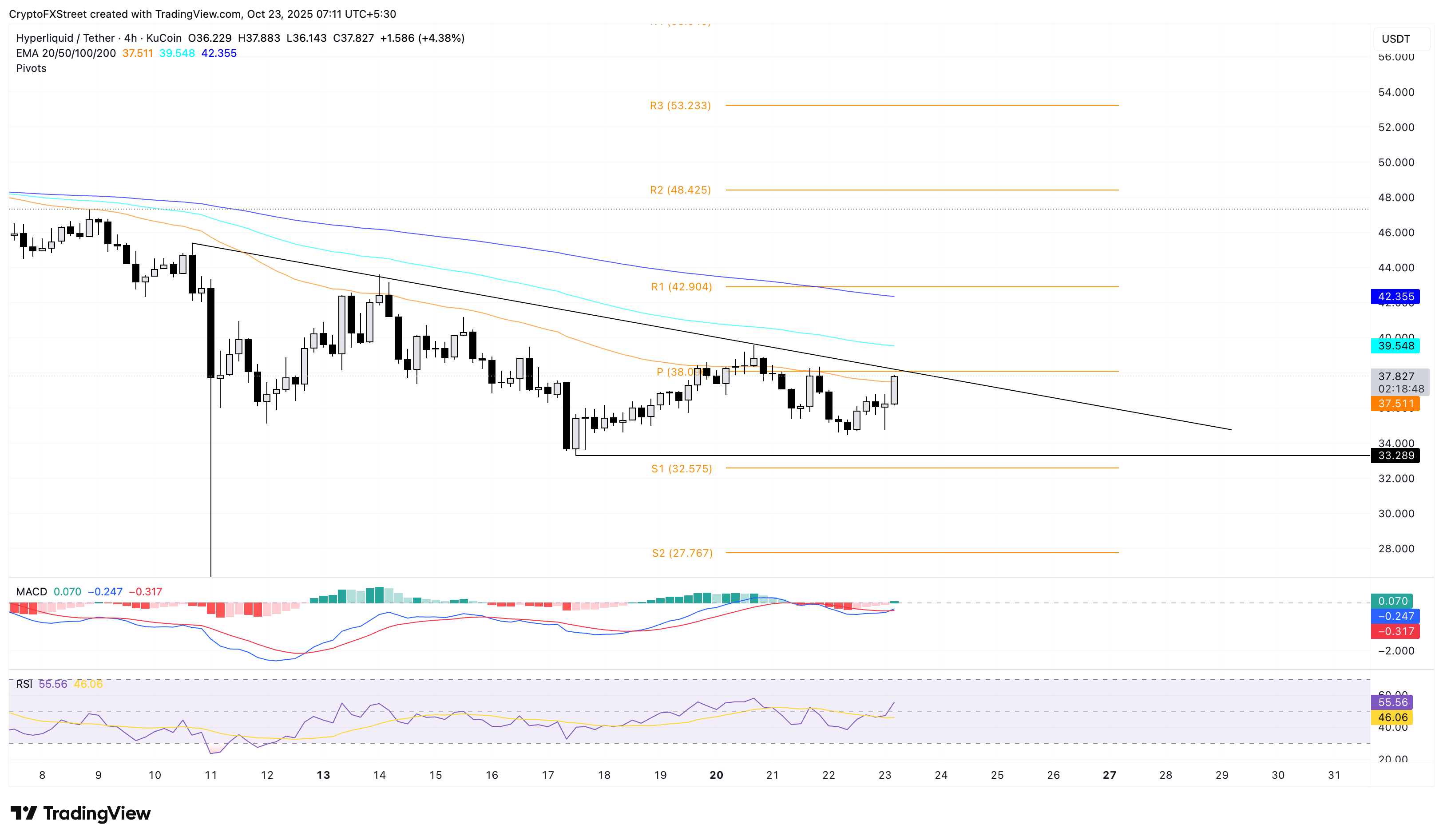• Hyperliquid recovery gains traction, approaching the resistance trendline of a descending triangle pattern on the 4-hour chart.