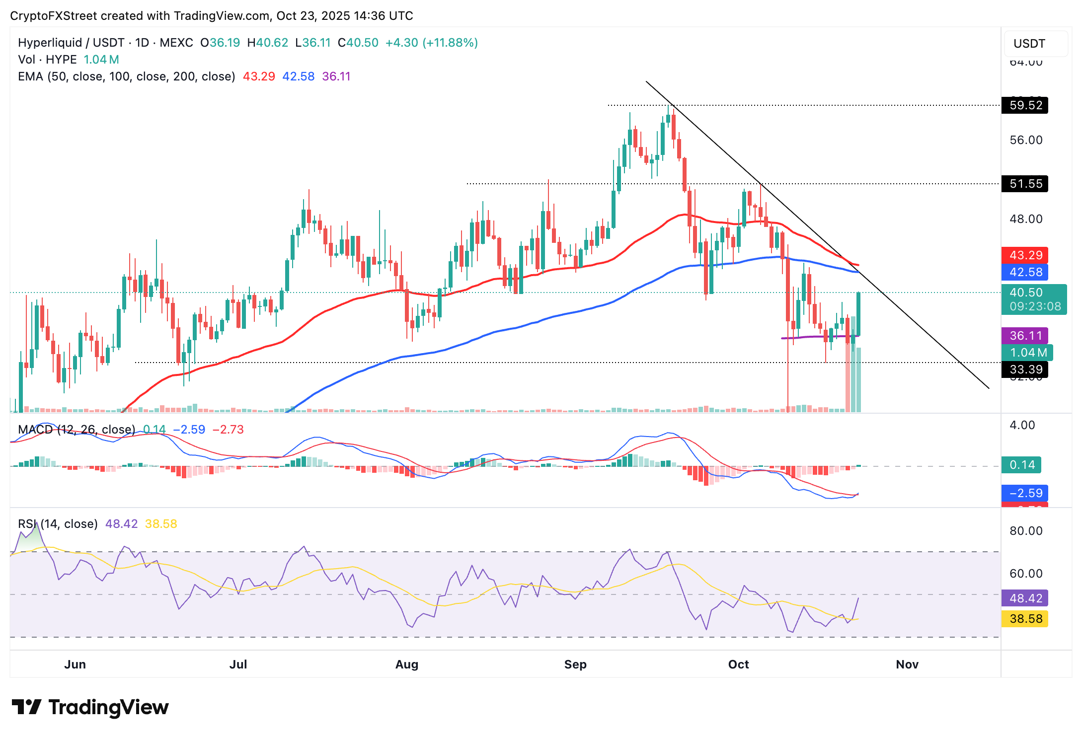 Hyperliquid edges higher, trading above $40.00 at the time of writing on Thursday, supported by the 200-day Exponential Moving Average (EMA) at $36.11. The engulfing green candle on the daily chart mirrors positive sentiment in the broader crypto market.