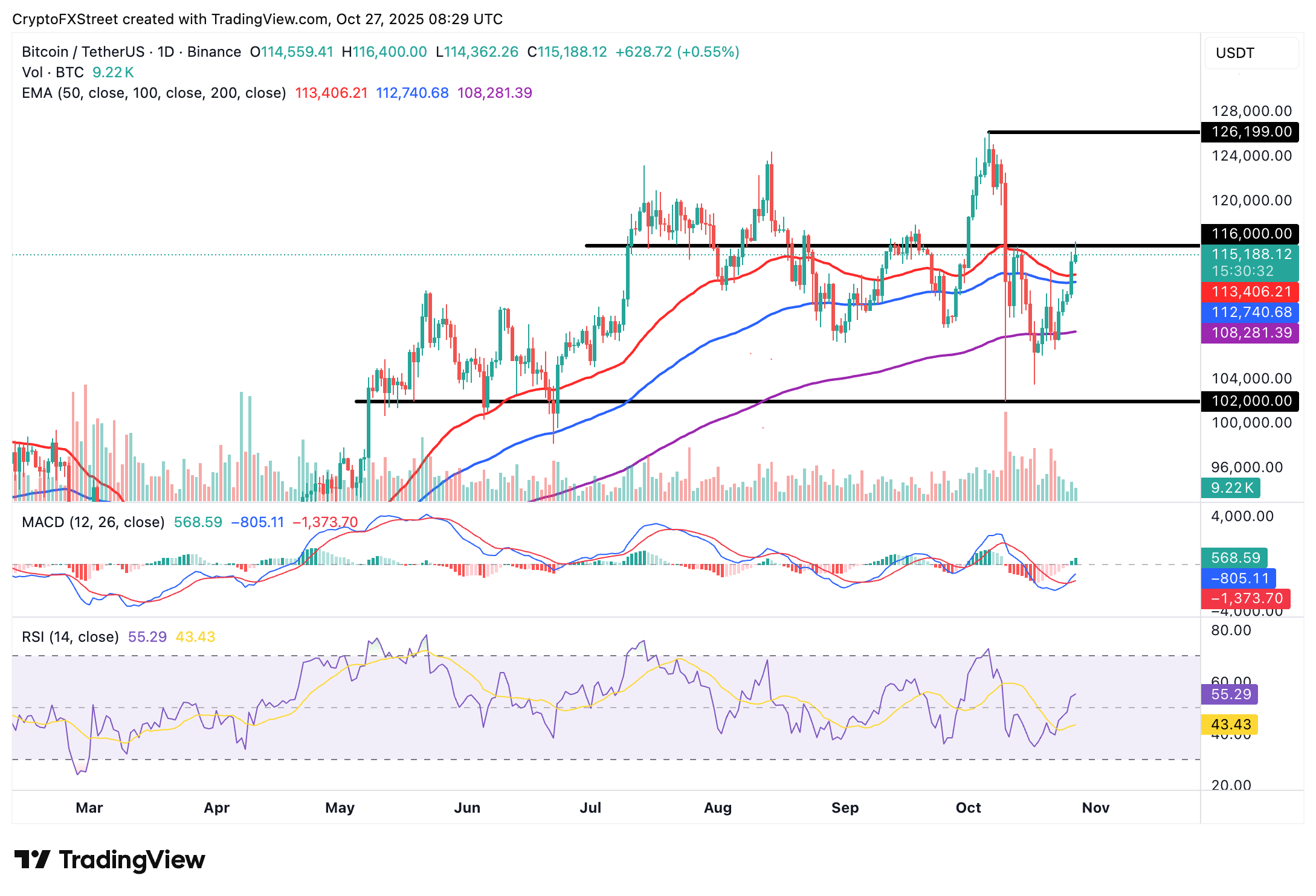 Bitcoin offers bullish signals at the time of writing on Monday after reclaiming its position above the 100-day Exponential Moving Average (EMA) at $112,740 and the 50-day EMA at $113,406 on the daily chart.