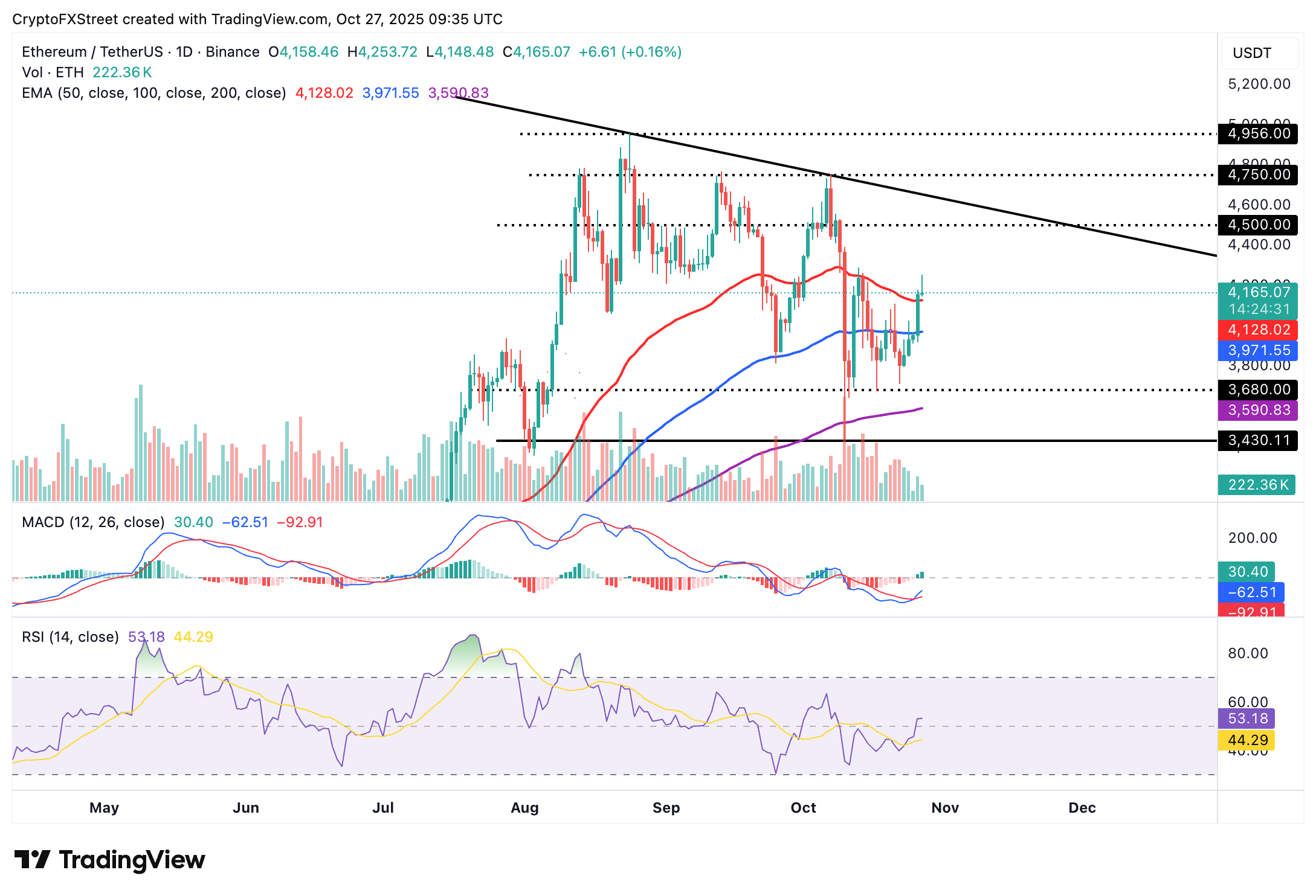 Ethereum is largely in bullish hands, holding above the 50-day EMA support at $4,128 on the daily chart. A buy signal from the MACD indicator, maintained since Sunday, supports the bullish outlook.