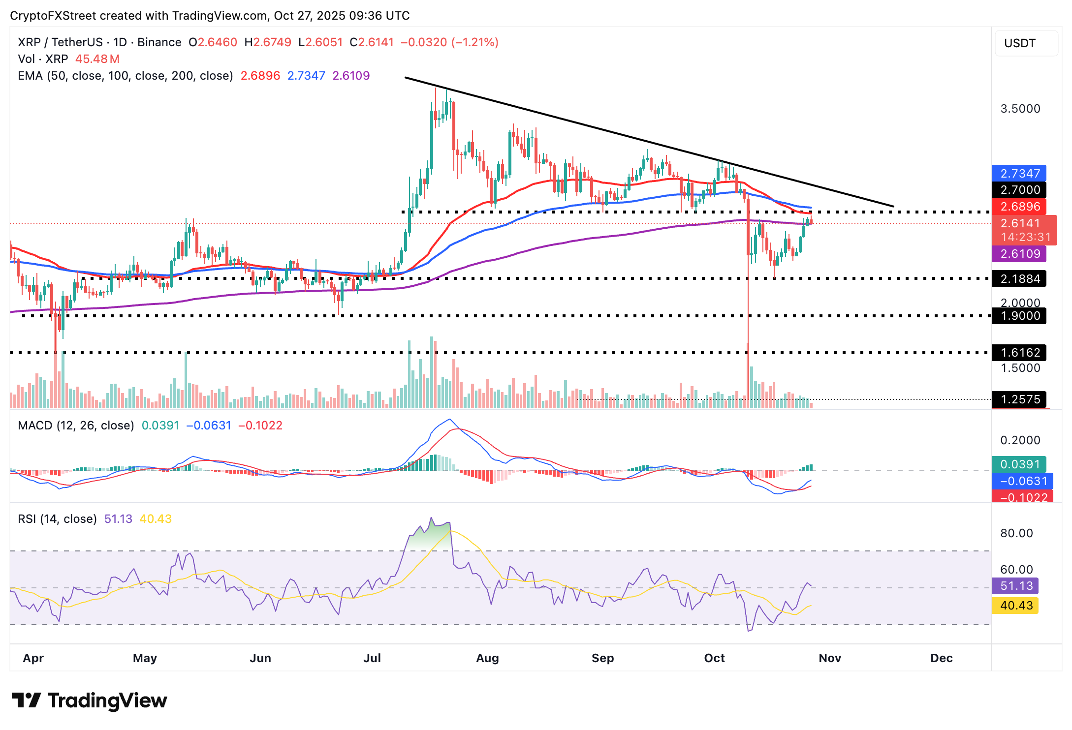 XRP holds above $2.61 support at the time of writing, highlighting an improving technical picture that is likely to sustain the short-term uptrend.