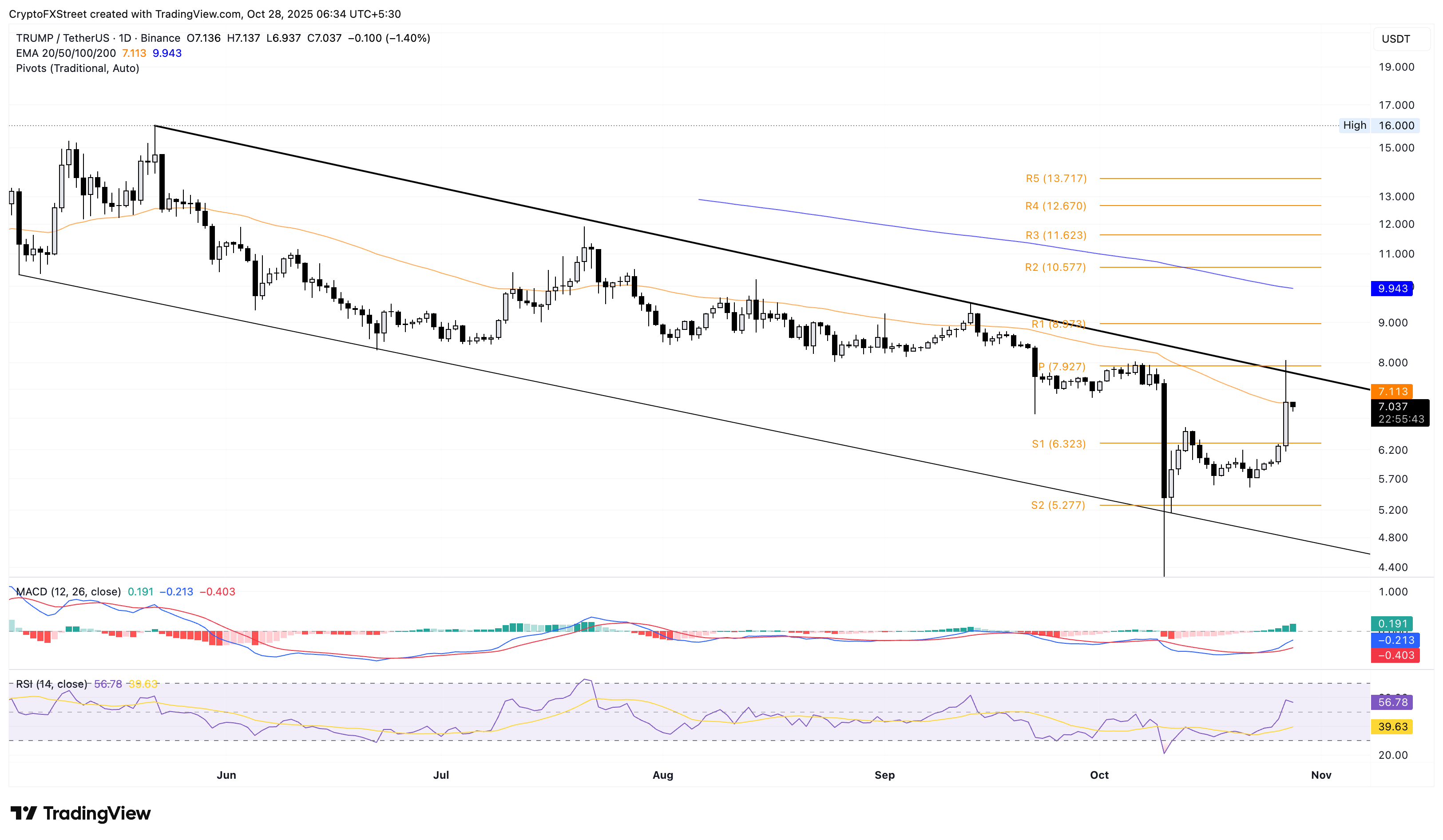 The Official Trump token edges lower by over 1% at press time on Tuesday, after Monday's 13% jump. The TRUMP token struggles to surpass the 50-day Exponential Moving Average (EMA) at $7.113.