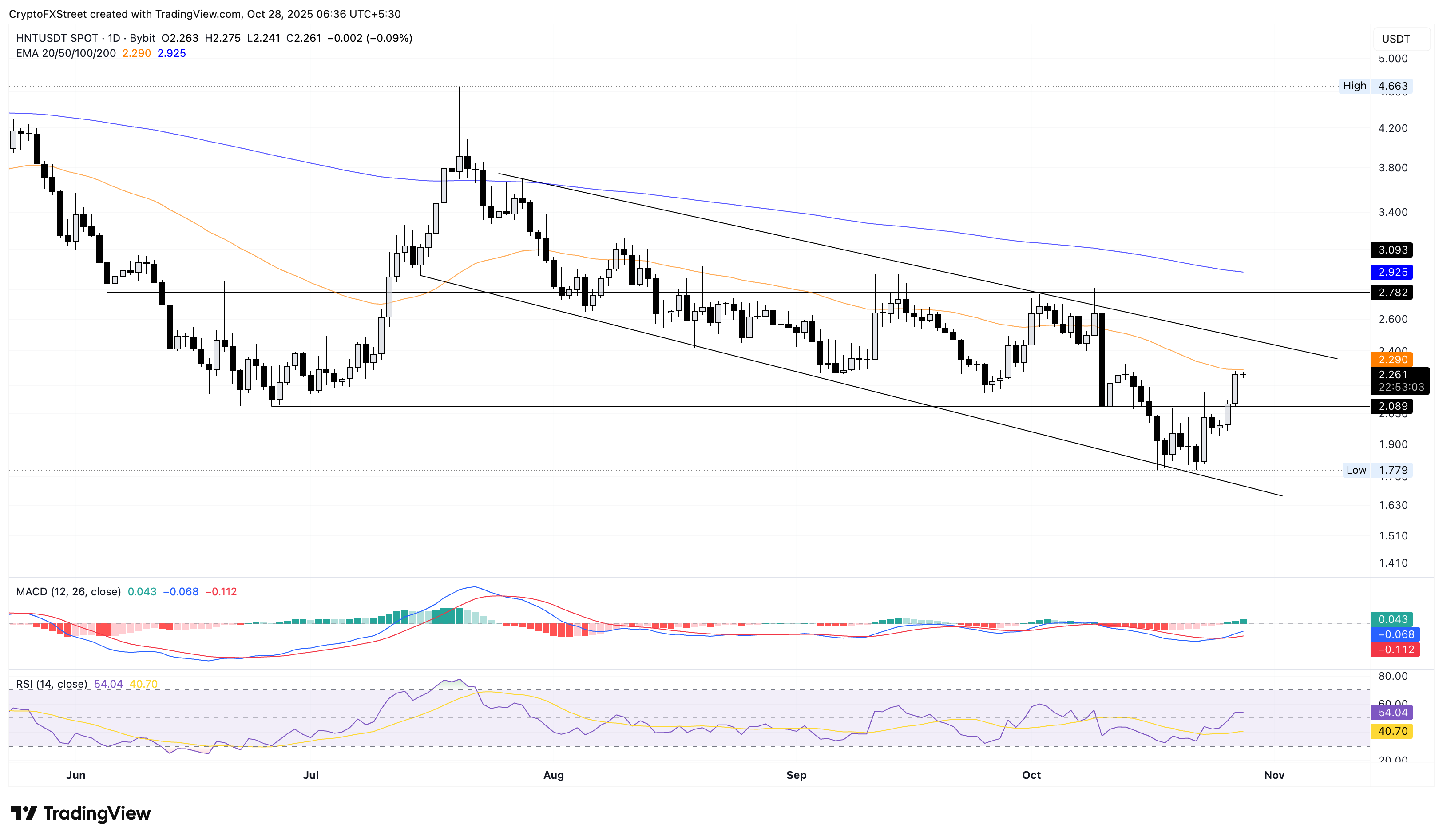 If HNT extends the uptrend above this dynamic resistance, it could target the declining trendline at $2.400. In case of the channel’s bullish breakout, the rally could target the $2.782 level, last tested on October 9.