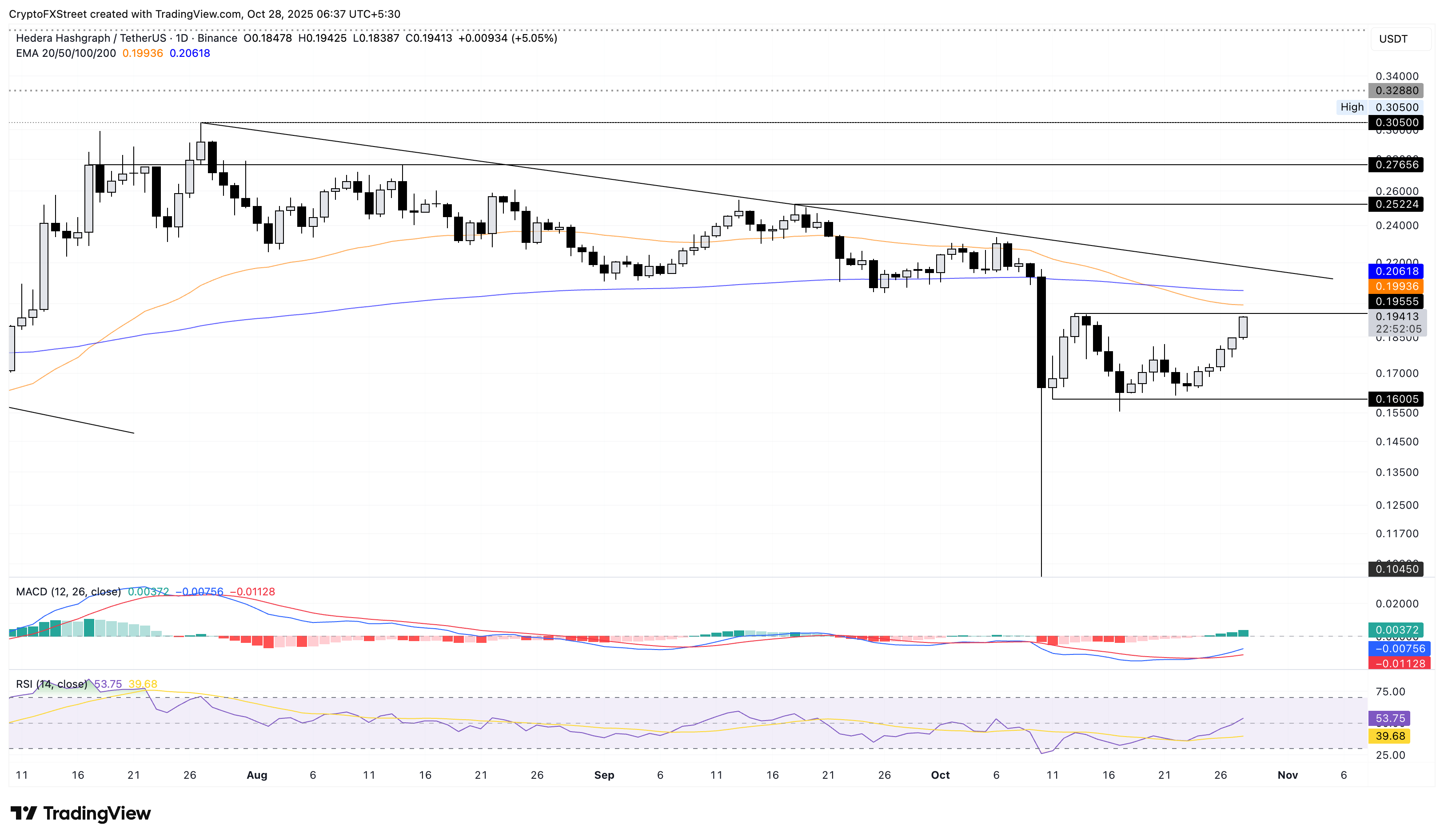 If HBAR flips from $0.1955, it could retest the $0.1600 support, marked by the October 11 low.