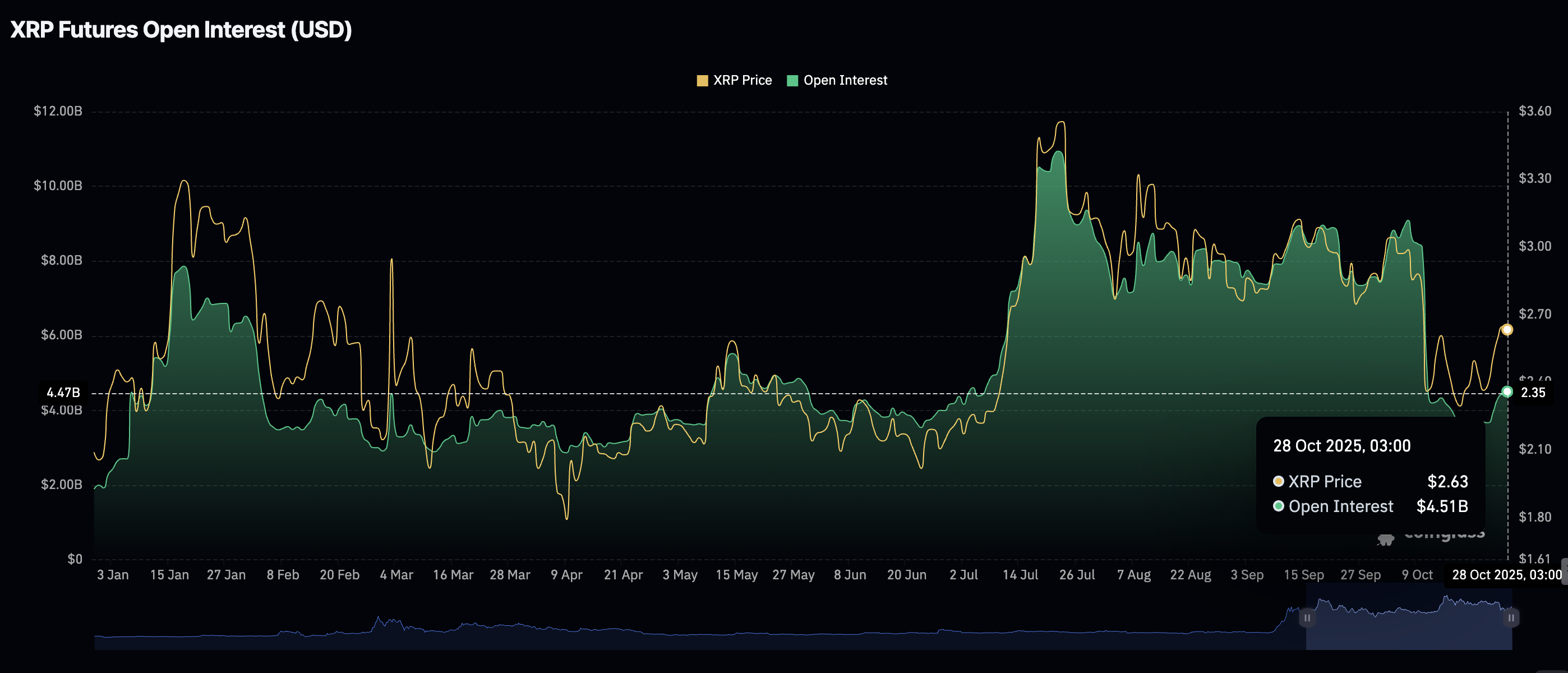 Retail interest in XRP is gaining momentum, as evidenced by the futures Open Interest (XRP), which averages $4.51 billion on Tuesday. According to CoinGlass data, OI, which tracks the notional value of outstanding futures contracts, plunged to $3.49 billion on October 19, the lowest level since late April, as risk-off sentiment spread across the cryptocurrency market amid broader macroeconomic uncertainty and the trade stand-off between the US and China.