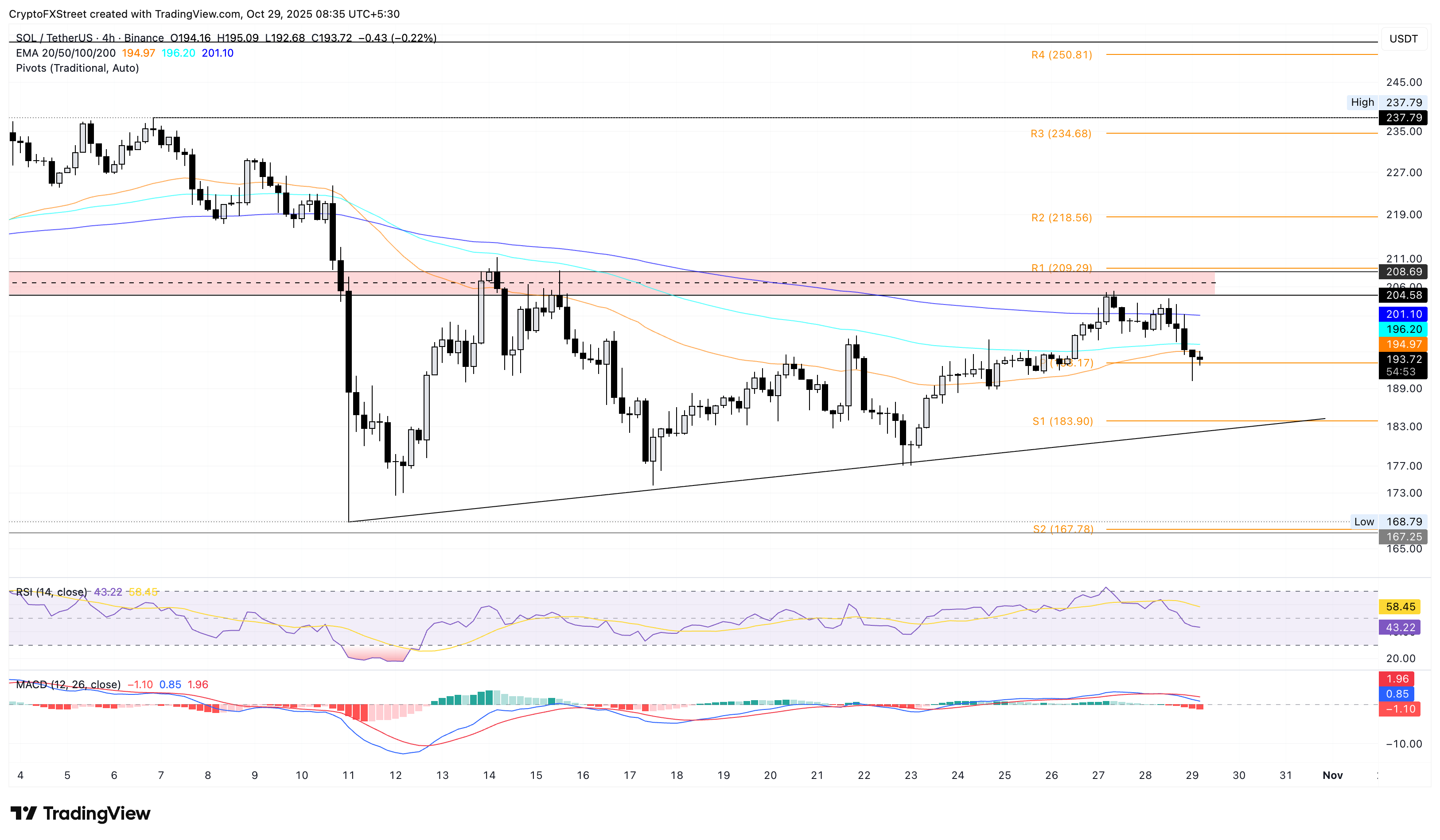 Solana holds above $190 at press time on Wednesday, avoiding further losses after the 2% decline on Tuesday. The reversal from the $204-$208 supply zone tests the central Pivot Point at $193 on the 4-hour chart, after breaking below the 50-period Exponential Moving Average (EMA) at almost $195.