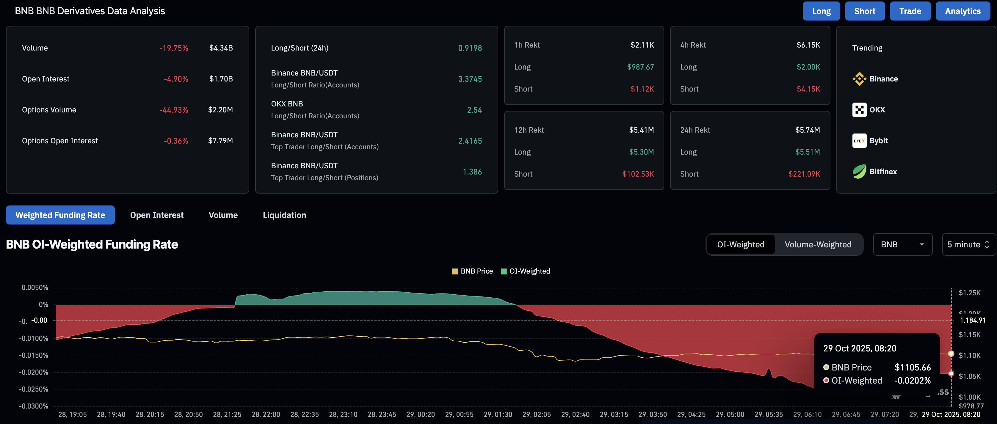 Anticipating further losses, the retail demand for BNB has significantly dropped in the derivatives market. CoinGlass data shows a 4.90% drop in BNB futures Open Interest (OI) over the last 24 hours to $1.70 billion, suggesting traders are either reducing their exposure or position leverage.