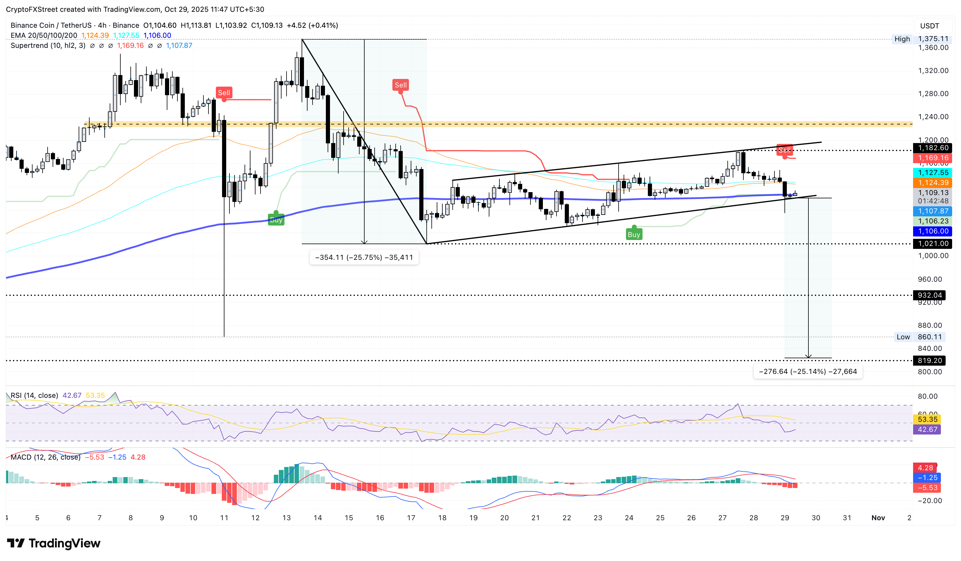 BNB holds above the 200-period EMA on the 4-hour chart at $1,107, and a local support trendline formed by connecting the October 17 and October 22 lows, part of the bearish flag pattern. The 25% pullback from October 13 to October 17 acts as the downward flagpole of this pattern near $820.
