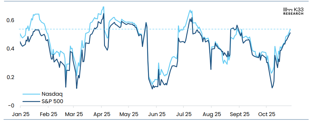 The graph below shows that the correlation between BTC and US equities has been rising lately. The 30-day correlation between BTC and the Nasdaq have risen to 0.53, the highest level since late August. With elevated correlations, earnings and the FOMC are poised to significantly influence BTC's direction.