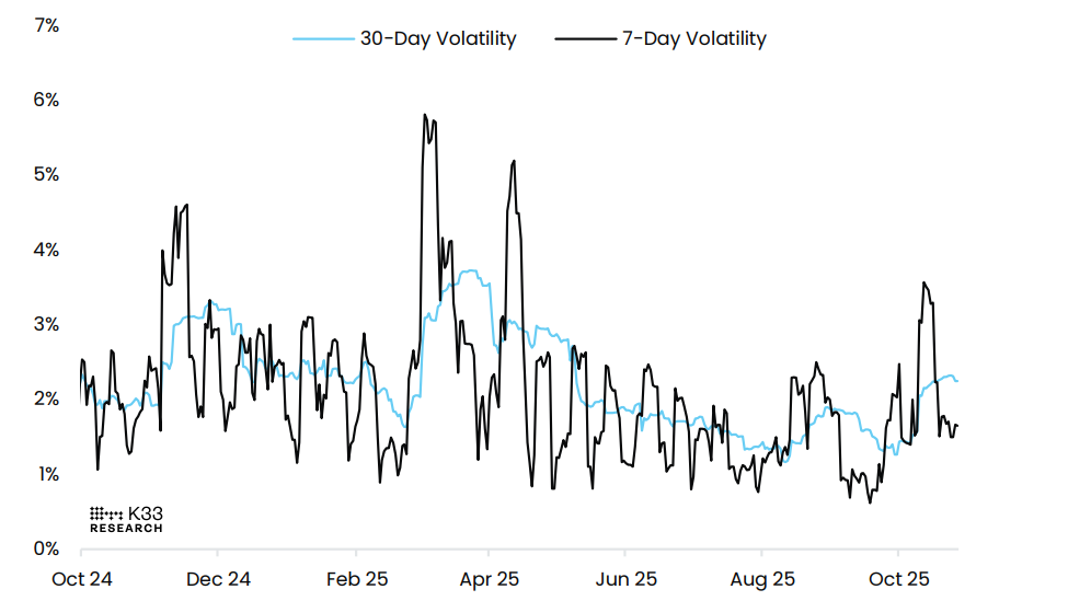 Looking at Bitcoin’s volatility chart reveals the current market dynamics. While Bitcoin’s 7-day average volatility has eased to 1.6% from 1.8%, intraday swings remain significant. On October 21, BTC surged 5% and retraced the entire move within the same 24-hour period — a rare occurrence that signals constrained liquidity and typically appears near price extremes. Notably, such gain-and-reversal patterns haven’t been observed since the early April tariff tantrum, roughly 193 days ago. Traders should be cautious of upcoming volatility.