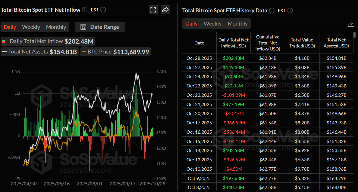 Bitcoin (BTC) remains steady near $113,000 at the time of writing on Wednesday, as traders adopt a cautious stance ahead of key macro and corporate catalysts. The US Federal Reserve (Fed) is expected to announce its interest rate decision, and major tech giants — Microsoft, Alphabet, Meta, Apple, and Amazon — are set to report earnings, which could bring fresh volatility to both traditional and crypto markets. Meanwhile, US-listed spot Bitcoin Exchange Traded Funds (ETFs) continue to show strong demand, recording $202.48 million in inflows on Tuesday, extending a four-day positive streak.